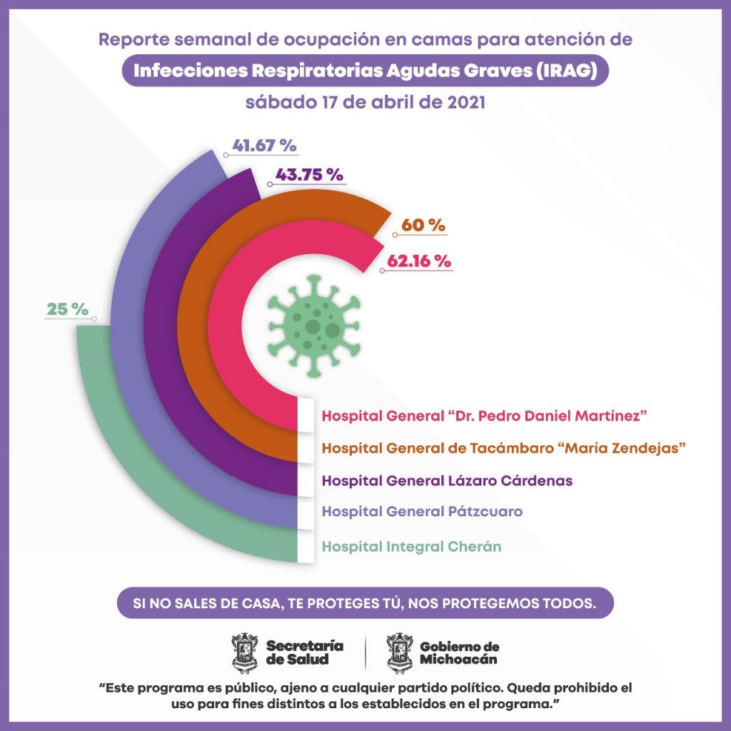 Redacción / La Voz de Michoacán Morelia, Michoacán. Hace una semana, el Hospital General “Dr. Pedro Daniel Martínez” registraba 54% en ocupación de camas para pacientes enfermos de COVID-19; hoy está al 62.16%, de acuerdo con la Secretaría de Salud de Michoacán. Las cifras oficiales en el estado sobre la emergencia sanitaria indican que Uruapan, el tercer municipio con la mayor incidencia del coronavirus en el estado, tiene actualmente 281 enfermos que mantienen la epidemia activa. Además, hay 65 casos considerados como sospechosos. Este viernes 16 de abril, Uruapan reportó 33 nuevos contagios; en total acumula 5 mil 171 casos confirmados, 455 defunciones y 4 mil 435 pacientes se han recuperado. La SSM también informó sobre la capacidad hospitalaria que presentan otros nosocomios de la entidad, como el Hospital General de Tacámbaro “María Zendejas, con 60 por ciento; el Hospital General de Lázaro Cárdenas “Dra. Elena Avilés”, con 43.75 por ciento; el Hospital General de Pátzcuaro, con un 41.67 por ciento, y el Hospital Integral de Cherán, con un 25 por ciento. El gobernador del estado, Silvano Aureoles Conejo, advirtió en su momento sobre el riesgo de una tercera oleada de COVID-19 en Michoacán debido a las vacaciones de Semana Santa y por campañas políticas, cuyos efectos empezarían a palparse a partir del 20 de abril, previendo una situación crítica a mediados de mayo. La dependencia sanitaria estatal, que encabeza Diana Carpio, reiteró el exhorto a la población de mantener las medidas sanitarias como la sana distancia, el uso de cubrebocas, así como la desinfección de manos para protección propia y de los sectores vulnerables. En general, a la fecha Michoacán suma 59 mil 395 contagios acumulados, 5 mil 169 defunciones y 52 mil 435 personas dadas de alta después de superar al COVID-19. Se mantienen activos mil 106 enfermos, 804 casos están a la espera de resultado y 146 nuevos confirmados se agregaron este viernes al registro estatal. En lo que lleva de transcurrida la pandemia en el estado, se han aplicado 143 mil 461 muestras de detección del virus SARS-CoV-2.