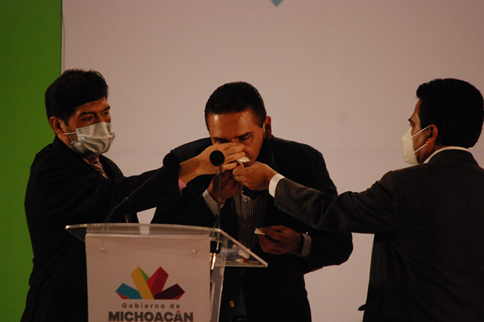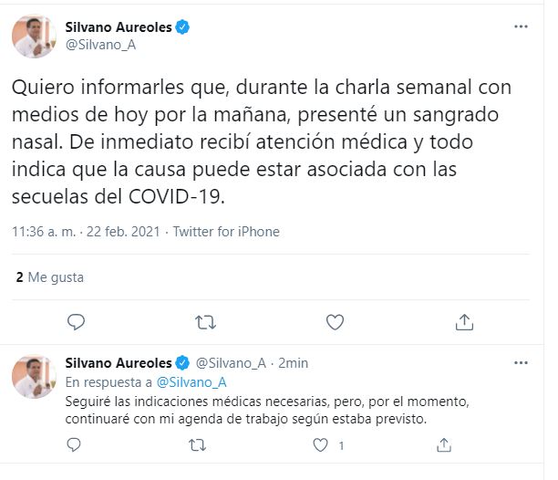 Redacción / La Voz de Michoacán Morelia, Michoacán. Durante la rueda de prensa con medios de comunicación, al gobernador de Michoacán, Silvano Aureoles, le salió sangre por la nariz. En el momento en que daba a conocer que no se iba a meter en temas que alteren el proceso electoral en el estado, el gobernador tuvo que parar la charla con medios ya que le empezó la hemorragia y de inmediato fue auxiliado para parar el sangrado. “Quedan las secuelas de la pandemia y después de que salí, tenía con frecuencia este tipo de reacciones” Acto seguido, el mandatario se despidió de los presentes y suspendió la rueda de prensa. Foto: Sam Herrera Jr. Foto: Sam Herrera Jr. Minutos más tarde el gobernador escribió en su cuenta de Twitter que "Quiero informarles que, durante la charla semanal con medios de hoy por la mañana, presenté un sangrado nasal. De inmediato recibí atención médica y todo indica que la causa puede estar asociada con las secuelas del COVID-19". Seguiré las indicaciones médicas necesarias, pero, por el momento, continuaré con mi agenda de trabajo según estaba previsto", escribió.