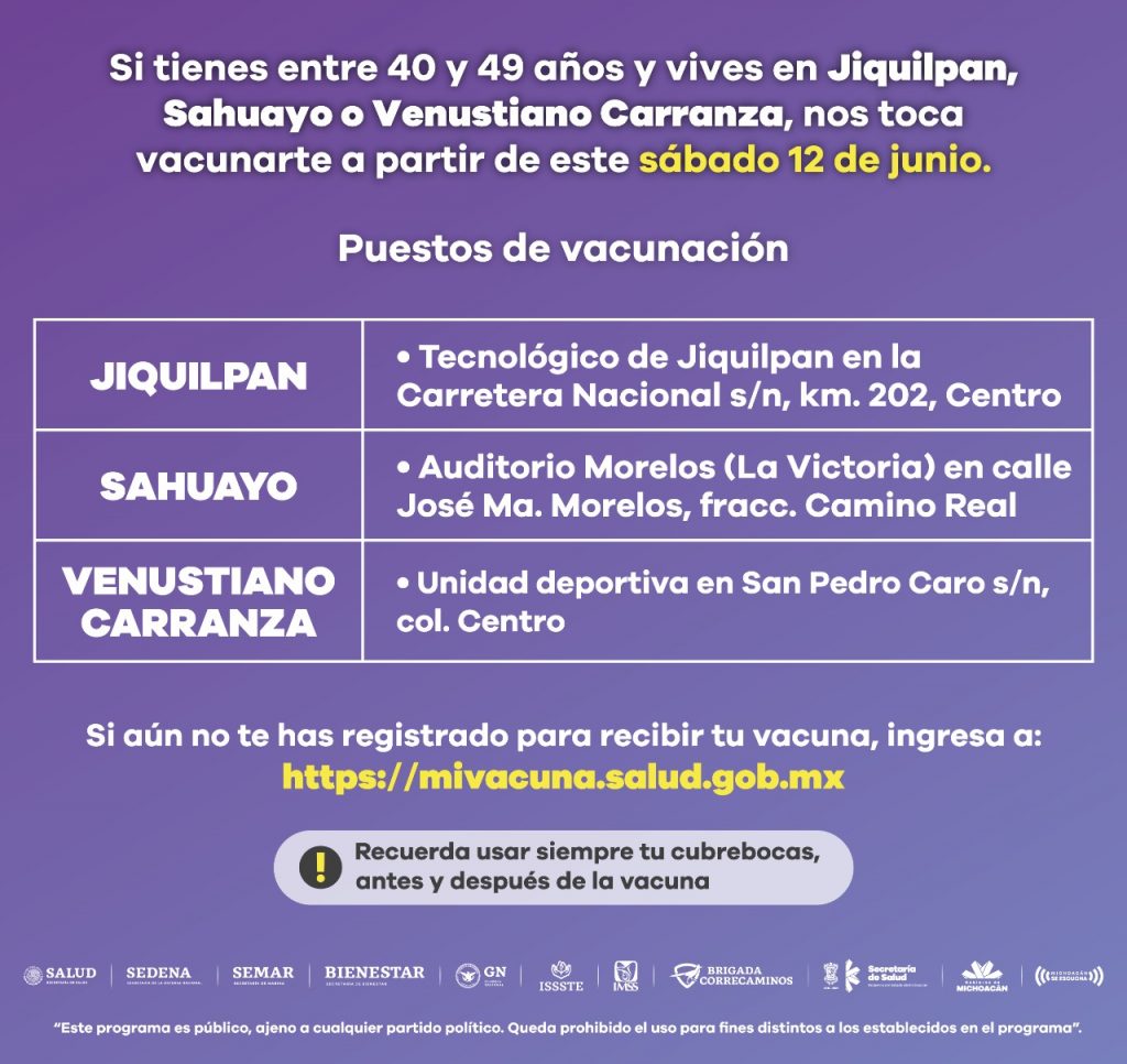 Redacción / La Voz de Michoacán Morelia, Michoacán. La Secretaría de Salud de Michoacán (SSM), informa que este sábado 12 y domingo 13 de junio, habrá jornada de inmunización a personas de 40 a 49 años en los municipios de Jiquilpan, Sahuayo y Venustiano Carranza. Los módulos de vacunación estarán instalados en los siguientes puntos: Auditorio Morelos, ubicado en la calle José María Morelos, fraccionamiento Camino Real, Sahuayo. Tecnológico de Jiquilpan, sobre la carretera Nacional S/N, KM 202, Centro, Jiquilpan de Juárez. Unidad Deportiva, San Pedro Caro s/n, colonia Centro, Venustiano Carranza. La vacuna que se estará aplicando en los tres municipios es de la farmacéutica AstraZeneca. A quienes aún no recibe su dosis pueden registrarse en la página https://mivacuna.salud.gob.mx/, donde se les generará un expediente de vacunación que deben presentar junto con una identificación oficial el día que acudan a inmunizarse. La SSM mantiene a disposición de la ciudadanía el 800-123-2890 con 11 líneas para resolver todas sus dudas médicas, así como el micrositio bit.ly/MichCOVID-19, donde encontrará toda la información del padecimiento.