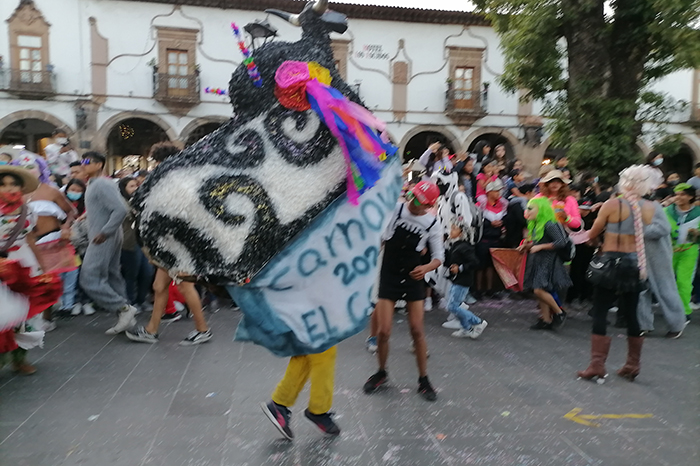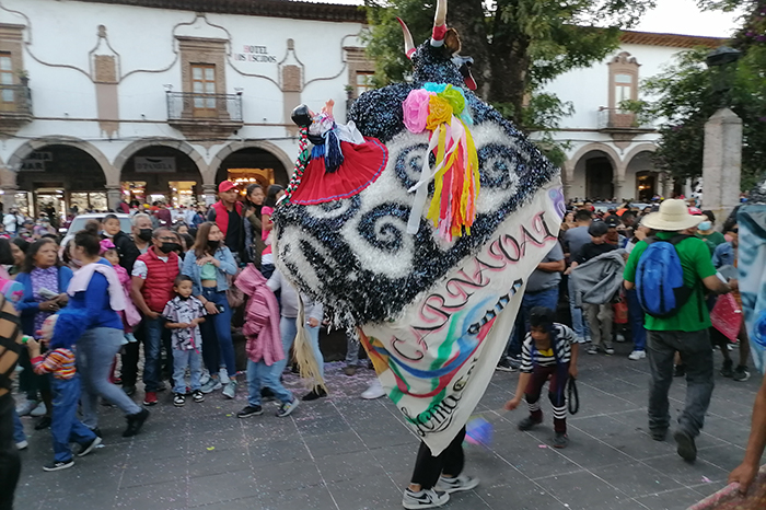 Angélica Ayala / La Voz de Michoacán Pátzcuaro, Michoacán. Tras un año de haber suspendido el torito de Carnaval por la pandemia de la COVID-19, nuevamente el torito salió a las calles de Pátzcuaro, bailando al son de la música de la banda de viento y acompañado de las maringuías y los “changos”, así como de los organizadores y de quienes colaboran para esta actividad, misma que inició el pasado domingo y concluyó este martes por la noche con la “matanza del toro”. Los toritos de la colonia Ibarra y Revolución, que son los más antiguos de la ciudad, así como de La Loma, El Cristo, Zapata y calle Obregón, salieron a recorrer las calles del pueblo, cada uno por su lado; sin embargo, cuando se encontraban la competencia entre ellos era muy notoria, ya que cada bando empezaba a gritar el nombre de su colonia, mientras que los toros retozaban y daban fuertes vueltas que parecían estaban volando. En la Plaza Vasco de Quiroga, el domingo por la noche se presentó el duelo entre el toro de La Zapata y el de la Revolución, ambos se colocaron casi de frente, en uno de los pasillos se juntaron las dos colonias, cada una con su bando, gritando más fuerte entre ellos, ambas bandas de música no paraban de tocar y el toro no paraba de dar vueltas y retozar, por el peso y movimiento, quien mueve y baila al toro se cambiaban los turnos, el chiste era no parar y demostrar que toro “aguantaba” más bailando y dando vueltas. Hasta que el toro de La Zapata decidió retirarse para que los de la Revolución se congratularan, gritando y brincando veían cómo el torito se iba retirando, entre bailes de los changos y las maringuías, así como del caporal, personajes que no deben faltar en cada una de las representaciones de esta actividad que fue utilizada por los sacerdotes franciscanos para la evangelización de los pueblos indígenas. El nombre original de esta gran figura que forran con papel de china y elaboran los cuernos y cara de madera, era “torito de petate”, de acuerdo al historiador Fernando Mendoza, los sacerdotes franciscanos utilizaron esta representación para atraer a los indígenas a la fe católica, “los españoles son quienes trajeron el toro a tierras mexicanas, así que idearon construir un toro de petate que iba recorriendo las comunidades, acompañado de un chichimeca, que eran quienes los cazaban y como recompensa la maringuía, que era la mujer indígena vestida con sus mejores galas, danzaba como agradecimiento y le colocaba una corona de flores en la cabeza al chichimeca”. Al concluir la evangelización, dijo el historiador, fue nombrado de Carnaval “al estar en Pátzcuaro la real aduana, cuando desembarcaba el Galeón de Manila con mercancía de China como la porcelana, biombos, laca, mármol, llegó un papel que se le llamaba de seda y que ahora conocemos como de china, fue entonces que cada uno de los barrios de la ciudad adoptó un color para distinguirse y adornaron a los toros con el papel de china de colores”. Foto, Angélica Ayala. El cohete que truena en el cielo anuncia la llegada del torito, la algarabía de los changos, que son hombres disfrazados de algún personaje de terror, o incluso de algún político, así como las maringuías, quienes también son varones que ridiculizan la figura de la mujer, con senos postizos, maquillaje exagerado, vestidos pegados y muy cortos, incluso hay quienes se vistieron solamente con un top y una falda minúscula, que al vuelo dejaban ver su ropa interior una tanga que iba arriba de un calzón largo. “Toca banda, toca banda”, era la orden que les daban al grupo de músicos, no querían que parara la música para seguir bailando. “Una monedita para el toro” era la petición de las personas que apoyan esta actividad, con una alcancía que cuelgan de su cuello piden la cooperación para pago de la música y los gastos que representa realizar esta actividad, “de a 50 pesos la bailada”, es el costo que las personas que pagaban el baile del toro de unos cuantos minutos, “¡alcancía!”, gritaba uno de los changos y una de las mujeres corrió para recibir el billete. Acto seguido, se organizaron en rueda los changos y las maringuías en medio el toro y a un costado la banda de música que empezó a tocar los sones, de inmediato el toro empezó a bailar y a girar por el aire, mientras que una de las maringuías vestidas a la usanza tradicional, como se acostumbraba, que es con el ajuar de la mujer purépecha y sosteniendo una servilleta con figuras cocidas a punto de cruz, toreaban al animal, que en respuesta iba de un lado a otro.