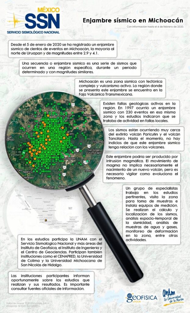 Redacción / La Voz de Michoacán Morelia, Michoacán. Este día el Sismólogico Nacional anunció que hasta el momento, se han reportado 2313 eventos de la secuencia sísmica registrada desde el 5 de enero en Michoacán. Los más grandes han sido cinco de magnitud 4.1. En lo que va de este miércoles (5 de febrero) se han registrado 22 movimientos, casi todos en San Juan Nuevo Parangaricutiro y con una magnitud promedio de 3.7. Hoy mismo se envió a la Ciudad de México el registro sísmico correspondiente del 31 de enero al 4 de febrero al Centro Nacional de Prevención de Desastres, cuya información será analizada y discutida en una reunión con un grupo de expertos en la materia, del Centro Nacional de Prevención de Desastres (Cenapred). Los integrantes de la Cenapred recogieron estudios sobre el enjambre sísmico que se ha presentado en los últimos días en la región Uruapan, esto para determinar la naturaleza de los temblores. Lo anterior fue dado a conocer por el coordinador de Protección Civil estatal, Pedro Carlos Mandujano Vázquez, quien añadió que se instaló un sismógrafo en el Instituto Tecnológico Superior de Uruapan, del cual, se recoge toda actividad tectónica que es enviada con oportunidad al Cenapred. Mandujano Vázquez indicó que con estos estudios se pretende confirmar o desmentir la hipótesis de que el enjambre sísmico podría ser producto de la intrusión magmática, lo que no implica necesariamente el nacimiento de un nuevo volcán, sin embargo es necesario vigilar cómo evoluciona. Los sismos de mayor magnitud de la secuencia fueron de magnitud 4.1, uno de ellos ocurrió a las 02:49 horas del día 23 de enero de 2020. Otro ocurrió el día 30 de enero alas 04:38 horas. Dos ocurrieron el día 2 de febrero, a las 19:47 y a las 22:58 horas. Y el día 4 de febrero se registró otro a las 19:18 horas. Las coordenadas de los epicentrospueden verse en la tabla del Anexo 1. El grupo de especialistas lleva a cabo los estudios pertinentes de las muestras que se tomaron en la región Uruapan, para calcular y localizar los sismos para su análisis espacio-temporal, así también la muestras de agua y gases, con la finalidad de descartar cualquier situación que ponga en riesgo la integridad física de las y los michoacanos”, puntualizó. Cabe señalar que en estos estudios participa también el Servicio Sismológico Nacional, el Instituto de Geofísica, el Instituto de Ingeniería y el Centro de Geociencias de la Universidad Nacional Autónoma de México, así como la Universidad de Colima y la universidad Michoacana de San Nicolás de Hidalgo. https://twitter.com/SismologicoMX/status/1225130875362430978?s=20 Este grupo multidisciplinario y diverso dará a conocer oportunamente el resultado de los estudios, con la finalidad de evitar falsos rumores e información que pueda provocar malas interpretaciones sobre el origen de estos movimientos telúricos”, concluyó