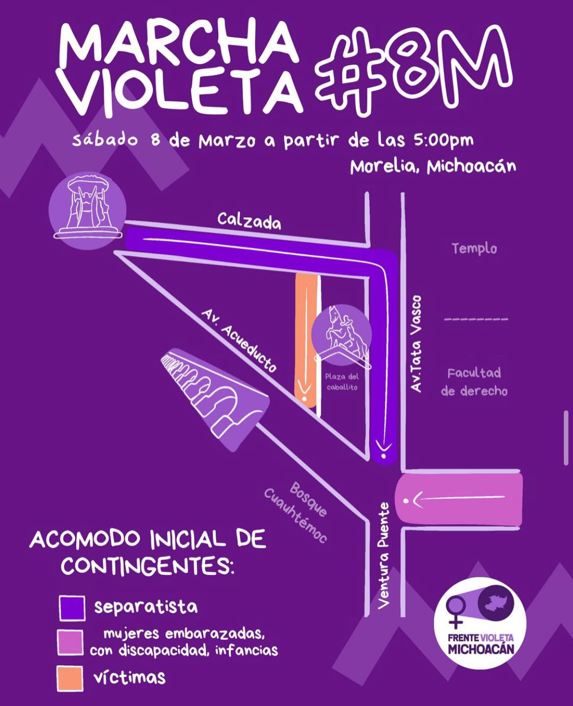 Redacción / La Voz de Michoacán Morelia, Michoacán. – La tarde de este próximo sábado 08 de marzo se llevará a cabo en Morelia la marcha por la conmemoración del Día Internacional de la Mujer, una movilización social en pro de la equidad de género y los derechos de las mujeres, donde las calles de la ciudad son tomadas para visibilizar problemáticas, exigir justicia y reivindicar derechos y, este año, de por lo menos dos lugares de la ciudad, saldrán contingentes de mujeres rumbo al primer cuadro de la ciudad. La marcha del 8M cuenta con la participación de diversos colectivos, cada uno con demandas y enfoques distintos, que suelen identificarse con consignas, pancartas y colores. Es por ello que se forman diferentes contingentes que, aunque marchan juntos, mantienen su propia identidad y objetivos particulares. El Frente Violeta Michoacán, conformado por diversas colectivas feministas y mujeres independientes, ha convocado a una marcha a las 17:00 horas, partiendo de la Plaza Morelos (El Caballito), pasando por el Acueducto para llegar a la Antimonumenta y culminando en Palacio de Gobierno. Su acomodo inicial de contingentes se conforma de la siguiente manera: Imagen: Instagram @defensorasdigitalesmich Separatista (color morado): Se encontrará desde la Avenida Tata Vasco hasta la Calzada Fray Antonio de San Miguel. Mujeres embarazadas, con discapacidad e infancias (color rosa): Se situará en la Avenida Acueducto, justo en la intersección con la Avenida Tata Vasco. Víctimas (color naranja): Se ubicará en la calle Morelos, ubicada entre la Plaza del Caballito y el Hotel Plaza Morelos. Contingente abortero (dentro del contingente separatista): Se colocará en la entrada de la Calzada, frente a Origo. Este contingente hace un llamado a las asistentes a portar un distintivo de color verde. Imagen: Instagram @defensorasdigitalesmich Con una organización estructurada y contingentes definidos, esta marcha busca garantizar un espacio seguro y accesible para todas las asistentes, visibilizando las diferentes luchas dentro del movimiento feminista. A pesar de las diferencias de puntos de partida, los contingentes coinciden en un mismo objetivo: exigir justicia y el respeto a los derechos de las mujeres.