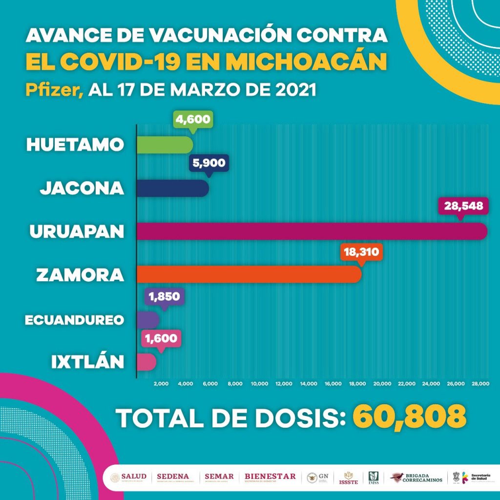 Redacción / La Voz de Michoacán Morelia, Michoacán.- Personal de enfermería, médico y paramédico de la Secretaría de Salud (SSM), ha participado en las jornadas de vacunación contra COVID-19 para la inmunización de adultos mayores de 60 años, donde hasta el momento se han aplicado 119 mil 798 dosis. Al ser los adultos mayores el sector de la población catalogado como el más vulnerable a perder la vida en caso de presentar la enfermedad, se trabaja de manera institucional para proteger a este grupo prioritario. Los 21 municipios que han sido beneficiados hasta el momento son: Huetamo, Jacona, Uruapan, Zamora, Ecuandureo, Ixtlán, Hidalgo, Lázaro Cárdenas, Villamar, Aporo, Tingambato, Buenavista, Apatzingán, Parácuaro, Múgica, Angangueo, Coalcomán, Tepalcatepec, La Huacana, Aguililla y Churumuco. La SSM exhorta a los adultos mayores que aún no cuenta con la protección contra COVID-19, a que se registren en https://mivacuna.salud.gob.mx/ para recibir el biológico de acuerdo con la calendarización programada por la Federación. Asimismo, mantiene a disposición de la ciudadanía el número 800-123-2890 con 11 líneas para resolver todas sus dudas médicas, así como el micrositio bit.ly/MichCOVID-19, donde encontrará toda la información del padecimiento.