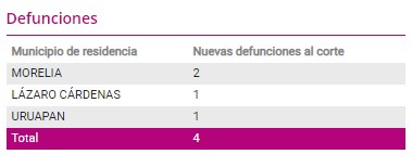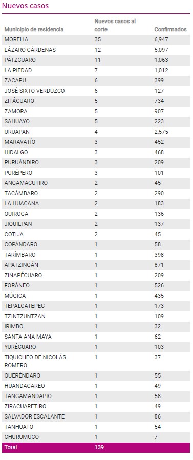 Casos acumulados Confirmados Recuperados Muertes Morelia6,9476,030497Lázaro Cárdenas5,0974,716303Uruapan2,5752,287248Pátzcuaro1,06392969La Piedad1,01287249Zamora90778689 Osiris Olachea / La Voz de Michoacán Morelia, Michoacán. En las últimas 24 horas se registraron en Michoacán 139 nuevos casos de COVID-19 en 38 municipios, de los cuales Morelia, Lázaro Cárdenas y Pátzcuaro concentran la mayoría, de acuerdo con el corte epidemiológico de este sábado. También este día se reportó la muerte de cuatro personas más que tenían la enfermedad de COVID-19, con las cuales suman 2 mil 335 defunciones en todo el estado por esta causa. En los más de 8 meses que lleva la epidemia en Michoacán se han infectado 29 mil 166 personas, de las cuales 87 por ciento ya se recuperaron: hoy 25 mil 496 superaron la enfermedad de COVID-19, provocada por la nueva cepa de coronavirus, denominada SARS-CoV-2. Sin embargo, la epidemia activa en el estado la conforman mil 335 personas que en los últimos 21 días comenzaron a presentar síntomas como dolor de cabeza, tos, fiebre, dolor muscular y articular, así como dolor al tragar, que son los más comunes relacionados con este padecimiento, pero no los únicos. La mayoría de los casos activos se encuentran en Morelia, con 420 habitantes que pueden contagiar a otros, seguido de La Piedad, donde hay 91 personas infectadas; Lázaro Cárdenas, con78 y Pátzcuaro, con 65. Además, hay mil 882 casos sospechosos en todo el estado, que son personas que podrían haberse infectado con el virus, pero no se tienen resultados de las pruebas de laboratorio para confirmarlo o descartarlo. Este sábado, Morelia es el municipio con más casos y más muertes nuevas: en las últimas 24 horas añadió 35 contagios y 2 defunciones, con las cuales alcanza los 6 mil 947 casos acumulados y 497 muertes. En la capital michoacana se han recuperado 6 mil 030 personas que tenían la enfermedad de COVID-19, mientras que otros 420 están enfermos y 472 son sospechosos. Lázaro Cárdenas tiene 12 positivos más, y con ellos su acumulado de casos es de 5 mil 097, pero de estos 4 mil 716 ya vencieron la enfermedad y 303 sucumbieron ante ella.