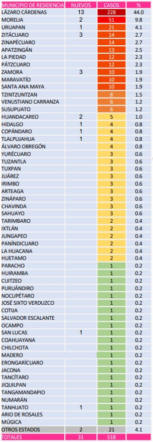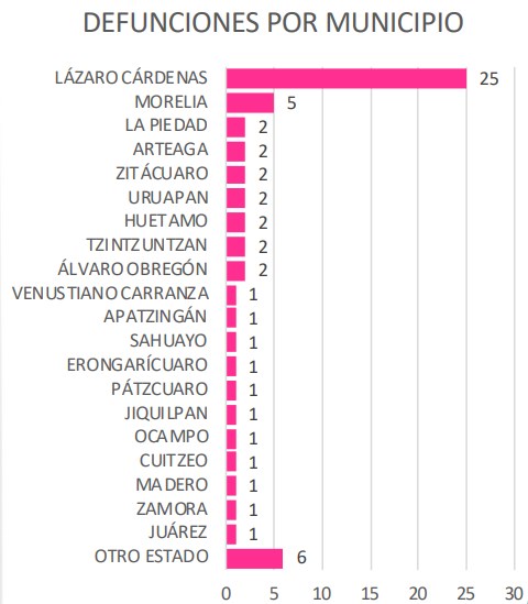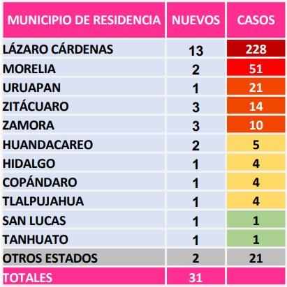 Osiris Olachea / La Voz de Michoacán Morelia, Michoacán. Michoacán sumó este jueves 31 casos nuevos de la enfermedad de COVID-19, la mayoría de ellos en Lázaro Cárdenas, y llegó a 518 casos confirmados en total, de los cuales 61 han fallecido, tres de ellos en las últimas horas, y 150 se han recuperado ya al padecimiento causado por el virus del SARS-CoV-2. El virus tiene presencia en la mitad de los municipios de Michoacán, al sumarse hoy San Lucas y Tanhuato con sus primeros casos, de acuerdo con el informe presentado esta noche por las autoridades sanitarias estatales. El resto de los municipios que reportaron hoy nuevos contagios son: Lázaro Cárdenas continúa a la cabeza con más casos, al llegar este jueves a 228 en total, lo que representa 44 por ciento de los contagios totales en la entidad. Además, el municipio portuario es también el que tiene más muertes por complicaciones relacionadas con la nueva cepa del coronavirus, con 25 decesos, seguido de Morelia, que tiene 5 fallecimientos, mientras que Uruapan, Zitácuaro, Tzintzuntzan, Álvaro Obregón, Huetamo, La Piedad y Arteaga tienen dos cada uno. Fuente: Departamento de Epidemiología de la Secretaría de Salud. Diseño: La Voz de Michoacán. Los municipios que solo han reportado un fallecimiento, de acuerdo con la Secretaría de Salud estatal, son Apatzingán, Pátzcuaro, Zamora, Cuitzeo, Sahuayo, Venustiano Carranza, Erongarícuaro, Jiquilpan, Ocampo, Madero y Juárez. Además, 6 personas con residencia en otros estados han fallecido en Michoacán, por lo que se reportan en el informe local. El número de pacientes hospitalizados aumentó a 40 en todo el estado, de los cuales 28 se encuentran en estado de gravedad. La mayoría, 35, se atienden en hospitales públicos y 5 en privados. Los municipios que hasta hoy reportan casos acumulados de COVID-19, es decir incluyendo los fallecidos, recuperados y los que tienen la enfermedad activa, de acuerdo con la Secretaría de Salud de Michoacán, son: Entre los nuevos contagios están un bebé que aún no cumple 1 año de edad, así como una persona de 93 años, que es la de mayor edad en contraer el virus. Hasta hoy 418 casos continúan como sospechosos, 72 más que el miércoles, de un total de 2 mil 636 pacientes estudiados en todo el estado. Enfermedad afecta más a hombres Al igual que como ocurre en el resto del país, en Michoacán el nuevo virus SARS-CoV-2 afecta más a hombres que a mujeres, pues de todas las personas que han sido diagnosticadas positivas, 60 por ciento son hombres. De acuerdo con el comunicado técnico diario emitido por la Secretaría de Salud, hasta hoy 313 hombres han enfermado de COVID-19, de los cuales 47 han muerto, cifra equivalente a 77 por ciento de los decesos totales. En cuanto a mujeres, 205 han sido diagnosticadas con COVID-19 en el estado, de las cuales 14 han muerto, cifra que representa 22.9 por ciento de los fallecimiento totales. Los síntomas más comunes entre los pacientes con la enfermedad causada por el coronavirus son tos, fiebre, dolor de cabeza, dolor muscular, dolor de articulaciones y ataque al estado general, así como dolor al tragar y calosfríos. Además, la mayoría de los pacientes con COVID-19 presentan obesidad como uno de los principales factores que agravan el padecimiento, seguido de hipertensión, diabetes y tabaquismo.