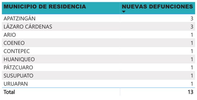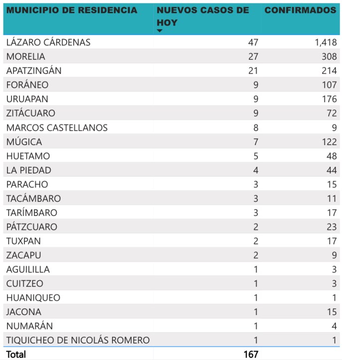 La Voz de Michoacán te presenta todas las noches el último reporte de la Secretaría de Salud de casos de COVID-19 Confirmados Recuperados Muertes Lázaro Cárdenas1,41888996Morelia30815820Apatzingán21410222Uruapan1767122Múgica1222215Zitácuaro723011 Jorge Manzo / La Voz de Michoacán Morelia, Michoacán. Michoacán registra el segundo día de más contagios por coronavirus al contabilizar a 167 pacientes nuevos, y 13 defunciones por complicaciones. Lázaro Cárdenas sigue con la mayor tasa de casos nuevos positivos al reportar 47 personas aisladas por la presencia de la enfermedad. Hoy Morelia también reporta un incremento en los casos al oficializar en 27 personas con COVID-19. En tercer lugar, se ubica Apatzingán con 21 personas enfermas. De acuerdo con el corte epidemiológico del Comité de Seguridad en Salud en Lázaro Cárdenas y Apatzingán se registraron tres defunciones en cada municipio, mientras que, en Uruapan, Pátzcuaro, Coeneo, Copándaro, Huaniqueo, Susupuato y Ario se reportó un fallecimiento en cada uno. En estos momentos, mil 629 personas se encuentran en aislamiento obligado, una vez que se tiene la sospecha de que dieron positivo a la enfermedad. En estos momentos en Michoacán hay mil 157 personas que tienen activo el padecimiento. En total, la entidad reporta 3 mil 80 personas contagiadas y 258 defunciones, y la tasa de letalidad asciende al 8.3 por ciento. Se han levantado en total 10 mil 262 muestras para confirmar o descartar la enfermedad en personas que ya han presentado la sintomatología, entre ellas, tos, dolor de cabeza, fiebre, entre otras más. Fuente: Centro Estatal de Operaciones COVID-19 de la SSM. Diseño: Enrique Santiago, La Voz de Michoacán. Zitácuaro y Uruapan fueron los municipios que informaron del contagio de 9 personas, por lo que se ubicaron en la cuarta posición del mapa epidemiológico, seguido de Múgica con 7 pacientes y La Piedad con 4 enfermos. Zamora, que se encuentre entre los ocho municipios con banderas roja y amarilla, no reportó ninguna persona contagiada. Sin embargo, en Huetamo se confirmaron 5 nuevos pacientes por la enfermedad. En Tacámbaro se reportan 3 personas contagiadas, mientras que en Pátzcuaro y Tuxpan se sumaron 2 pacientes nuevos. En el municipio de la región lacustre también se confirmó un deceso. El 69 por ciento de los pacientes ha sido atendido en hospitales de la Secretaría de Salud en Michoacán, mientras que el 17 por ciento ha sido canalizado a unidades del Instituto Mexicano del Seguro Social. Entre personas de 30 a 59 años de edad se reporta la mayor cantidad de personas infectadas por el coronavirus. Consulta aquí la información completa por municipio