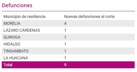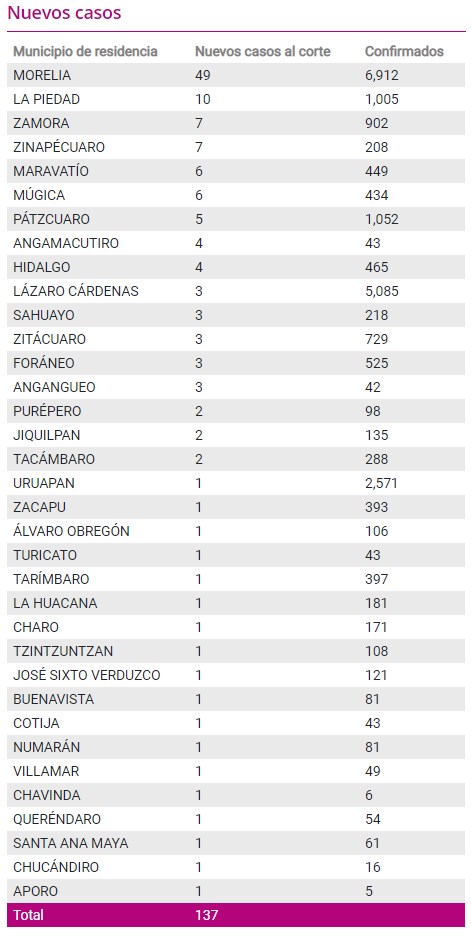 Casos acumulados Confirmados Recuperados Muertes Morelia6,9125,999495Lázaro Cárdenas5,0854,709302Uruapan2,5712,282247Pátzcuaro1,05292169La Piedad1,00586649Zamora90278289 Osiris Olachea / La Voz de Michoacán Morelia, Michoacán. Este viernes Michoacán registró 137 contagios nuevos de COVID-19, diseminados en 34 municipios, así como 9 muertes más, la mayoría de ellas en Morelia, ciudad que este día reportó la mayoría de los casos y defunciones, de acuerdo con el corte epidemiológico de las autoridades sanitarias. Hasta hoy la entidad acumula 29 mil 27 casos confirmados acumulados de la enfermedad, de los cuales 2 mil 331 han muerto, pero 25 mil 376 se han recuperado, es decir, 87 por ciento de los casos superaron los efectos que causa a la salud la nueva cepa de coronavirus, denominada SARS-CoV-2. Sin embargo, hay en el estado mil 320 personas que en estos momentos están enfermas y batallan con malestares como dolor de cabeza, tos y fiebre, que son los más comunes, y son ellos quienes representan la epidemia activa, debido a que comenzaron a presentar síntomas en las últimas 3 semanas. Estas personas son las que pueden contagiar a los demás y así mantener con vida la transmisión del virus. Además, la Secretaría de Salud de Michoacán (SSM) tiene identificados mil 892 casos sospechosos, que son personas que podrían haberse infectado por el coronavirus, pero no se tienen resultados de las pruebas que lo confirmen o lo descarten. Este 4 de diciembre, Morelia es el municipio en Michoacán que registra la mayor cantidad de contagios y muertes por COVID-19 en las últimas 24 horas: tiene 49 casos nuevos y 4 defunciones más, con las cuales alcanza los 6 mil 912 casos acumulados, de los cuales 5 mil 999 se han recuperado, 495 fallecieron y 418 están enfermos; otros 456 son casos sospechosos. La capital michoacana es el municipio más golpeado por el virus: concentra la mayoría de los contagios y muertes por COVID-19. Con 10 contagios más registrados en el último día, La Piedad rebasó hoy los mil casos positivos y tiene 1,005 en total, de los que fallecieron 49 y 866 superaron la enfermedad; 90 más son casos activos y 110 son sospechosos. Zamora, el quinto municipio michoacano más afectado en la pandemia, sumó hoy 7 contagios y con ellos llegó a 902 positivos, pero de estos 782 ya vencieron al COVID-19, mientras que 89 fallecieron y 31 están enfermos.