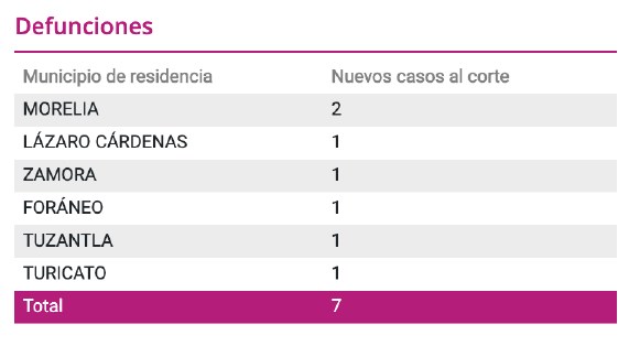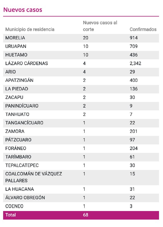 Jorge Manzo / La Voz de Michoacán Morelia, Michoacán. Michoacán registró la cantidad más baja de casos positivos del coronavirus de las últimas semanas al confirmar 68 pacientes contagiados y siete fallecimientos, sin embargo, hay mil 22 contagiados que deben mantenerse en casa, de lo contrario podrían dispersar el virus. La mayor cantidad de enfermos se concentró en Morelia, seguido de Huetamo y Uruapan. Lázaro Cárdenas sólo registró cuatro personas que solicitaron servicios por complicaciones a causa de COVID-19. Preocupa que de manera diaria la mayor cantidad de defunciones se tenga en la capital del estado. Ario de Rosales, con bandera verde, reportó cuatro casos positivos, cifra similar a la que se tuvo en el puerto, mismo que se mantienen como el municipio con la mayor cantidad de enfermos y defunciones. Ahí, dos mil 342 personas han sido portadoras del nuevo coronavirus y lamentablemente 130 han perdido la vida. Esperan resultados 240 personas debido a que podrían ser portadoras de esta enfermedad. Morelia es el municipio que tiene la mayor cantidad de personas que podrían dar positivo a COVID-19, una vez que 469 han manifestado síntomas como tos seca, dolor de cabeza, diarrea, fiebre y vómito. En el estado son mil 990 personas en esta condición, cifra que ha ido en descenso en los últimos días, sin embargo, se espera que se tenga un aumento de casos sospechosos a partir de la reapertura de bares, antros y restaurantes, que implican concentración de personas; el 65 por ciento incumple con protocolos básicos. Fuente: Centro Estatal de Operaciones COVID-19 de la SSM. Diseño: Enrique Santiago, La Voz de Michoacán. Nueve de los 14 municipios con bandera amarilla son los que reportaron casos positivos. Morelia reporta 20 personas contagiadas, Uruapan y Huetamo cada uno registró 10 pacientes. En Lázaro Cárdenas hubo cuatro infectados, mientras que en Apatzingán dos. En La Huacana, Pátzcuaro y Zamora tuvieron un caso cada uno. En tanto que, en los municipios con bandera verde, La Piedad tuvo dos personas contagiadas y Tarímbaro reportó un caso. Coeneo y Álvaro Obregón informaron de un caso cada uno, y Panindícuaro dos personas. Consulta aquí la información completa por municipio Alistan cambio de banderas Será el 31 de julio cuando se cambien banderas epidemiológicas en los municipios. Con esta acción, el Comité de Seguridad en Salud define la progresión de la enfermedad partiendo de indicadores claros como casos activos, letalidad y ocupación hospitalarias. En este momento, los municipios que siguen teniendo incremento sostenido de casos son Morelia, Uruapan, Huetamo y Lázaro Cárdenas, por lo que podrían ser los que cambien de banderas si sigue esta incidencia. De acuerdo con la autoridad, la ocupación hospitalaria es del 50 por ciento. Esta medida fue instaurada por el Comité de Seguridad en Salud a partir de la nueva convivencia que comenzó el primero de junio. Ya han transcurrido seis semanas de que comenzó la reapertura gradual de actividades, por lo que seguirán midiendo cómo evoluciona. Actualmente en 107 municipios tiene presencia el coronavirus. Municipios con bandera amarilla en Michoacán MUNICIPIO POSITIVOS MUERTES La Huacana 31 7 Pátzcuaro 97 10 LC 2,342 130 Zitácuaro 135 17 Sahuayo 15 1 Huetamo 435 25 Morelia 914 63 Zacapu 30 2 Zamora 201 26 Uruapan 709 58 Múgica 322 47 Puruándiro 14 1 Parácuaro 25 3 Apatzingán 400 35 Fuente: Dirección General de Epidemiología de la Ssa. Diseño: Enrique Santiago, La Voz de Michoacán.
