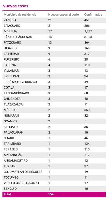 Casos acumulados Confirmados Recuperados Muertes Lázaro Cárdenas3,0032,666161Morelia1,8871,410132Uruapan1,174901113Huetamo51045534Apatzingán51744244Múgica35929553 La Voz de Michoacán te presenta todas las noches el último reporte de la Secretaría de Salud de casos de COVID-19 Osiris Olachea / La Voz de Michoacán Morelia, Michoacán. Con 154 casos nuevos de COVID-19 reportados en las últimas 24 horas, Michoacán llegó este viernes a 12 mil 141 casos acumulados de coronavirus, de acuerdo con el corte epidemiológico actualizado hoy por las autoridades encargadas de la atención a la emergencia sanitaria en el estado. También en el último día se registró la muerte de 24 personas más que tenían COVID-19, la mayoría de ellas en Uruapan, con las que la entidad alcanzó los 952 decesos por complicaciones del padecimiento causado por la nueva cepa de coronavirus. Hasta hoy se han recuperado 9 mil 517 pacientes que dieron positivo al SARS-CoV-2, lo que representa 78 por ciento de todas las personas infectadas en el estado. Fuente: Centro Estatal de Operaciones COVID-19 de la SSM. Diseño: Enrique Santiago, La Voz de Michoacán. Los casos activos son mil 672, es decir, es la cantidad de personas que comenzaron a manifestar síntomas como fiebre, tos y dolor de cabeza en las últimas tres semanas. Además, otras 2 mil 640 personas son sospechosas de haberse infectado y están a la espera de los resultados de laboratorio para confirmar o descartar que tengan COVID-19. En lo que va de la epidemia se han hecho análisis a 33 mil 718 habitantes del estado, de los cuales 18 mil 937 han dado negativo. Este día Zamora y Zitácuaro son los municipios con más casos nuevos: cada uno sumó 21 contagios. Zamora llegó a 451 casos acumulados, de los cuales 293 se han recuperado, 109 padecen la enfermedad de COVID-19 en estos momentos y 49 han fallecido; otros 92 habitantes son considerados casos sospechosos. Zitácuaro tiene en total 306 habitantes infectados, pero de dicho número, 190 ya superaron el padecimiento, 86 batallan contra sus síntomas, 30 murieron y 81 más esperan los estudios para saber si están contagiados. Morelia registró 17 nuevos casos, mil 887 en total, y de estos mil 410 vencieron al COVID-19, otros 345 todavía están enfermos, 132 fallecieron y 811 son casos sospechosos. La capital michoacana concentra actualmente el mayor número de casos activos y de casos sospechosos en todo el estado, y son ellos quienes podrían mantener viva la epidemia si contagian a otras personas. Con 14 casos nuevos, Lázaro Cárdenas superó hoy los 3 mil contagios acumulados de COVID-19, de los cuales la mayoría (2,666) ya se recuperó, 176 son casos activos, 161 murieron y 242 están en espera de resultados para saber si se infectaron con coronavirus.