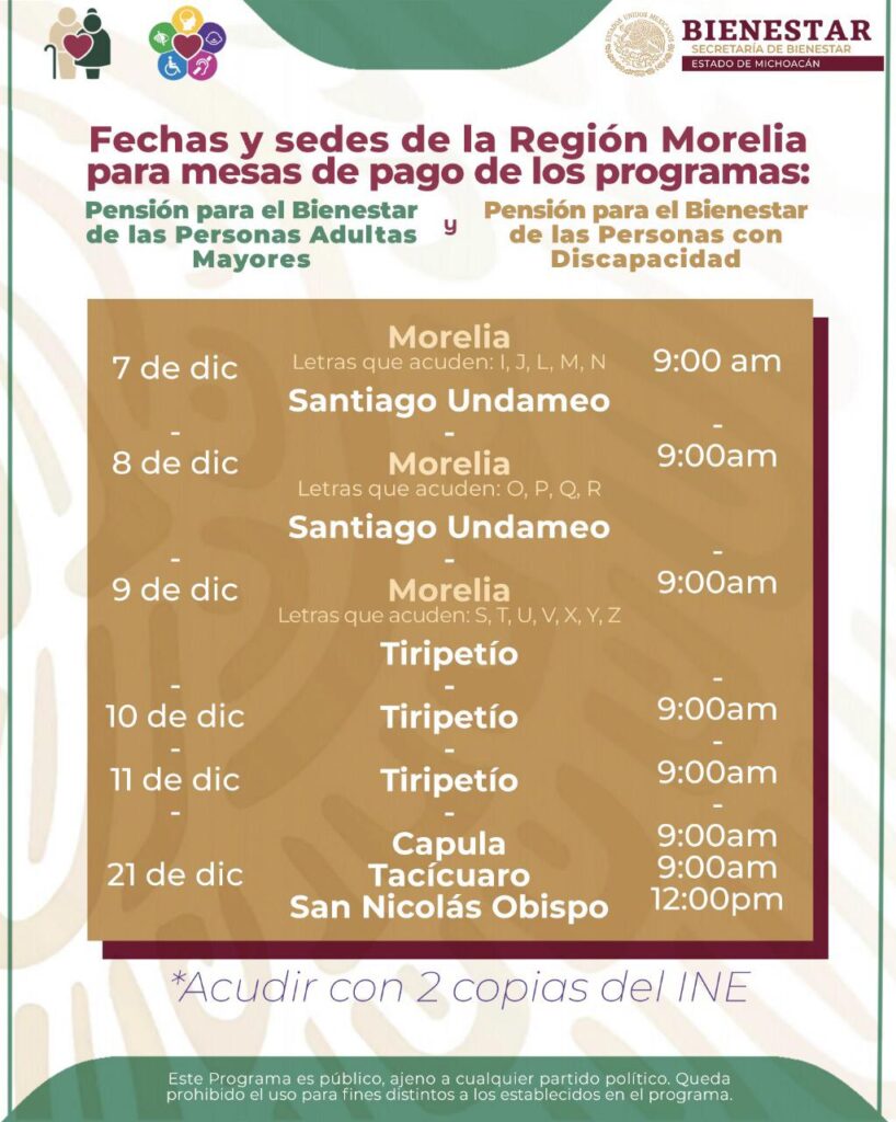 Morelia, Michoacán. Sí eres uno de los beneficiados de los programas Bienestar de las Personas Adultas Mayores o Personas con Discapacidad, a continuación te dejaremos los lugares, la hora y las letras de las personas a quien se les estará entregando sus respectivos pagos del programa. 9 de diciembre: Morelia y Tiripetío a las 9:00 horas. Letras que acuden: S, T, U, V, X, Y, Z 10 de diciembre: Tiripetío a las 9:00 horas. 11 de diciembre: Tiripetío a las 9:00 horas. 21 de diciembre: Capula a las 9:00 horas. Tacícuaro a las 9:00 horas. San Nicolás Obispo a las 12:00 horas. No olvides llevar 2 copias de tu Ine. Si aún no estás inscrito o desconoces en que consisten estos programas federales aquí te dejamos los requisitos: Requisitos para el programa bienestar de las personas adultas mayores: -Para las personas adultas mayores indígenas documento que demuestre residencia en alguno de los municipios catalogados como pueblos indígenas. -Documento de identificación vigente que puede ser la credencial para votar. -Clave Única de Registro de Población (CURP) -Para las personas de 65 a 67 años inscritas en el Padrón de derechohabientes del ejercicio 2018, solo se necesita estar activos en el padrón. Para inscribirte llama al número 01 800 007 3705, manda un correo a demandasocial@bienestar.gob.mx o busca a los servidores de la nación, quienes llevan un registro para inscribir a las personas. También puedes solicitar la inscripción a través de este formulario. Requisitos para el programa de becas para pensión el Bienestar de Las Personas con Discapacidad Este es un apoyo a niñas, niños y jóvenes de hasta 29 años que tienen discapacidad permanente, así como a personas con discapacidad de 0 a 64 años que vivan en comunidades indígenas. -Presentar Acta de Nacimiento. -Documento que acredite la discapacidad permanente, emitido por alguna institución pública del sector de salud federal, estatal o municipal. -Comprobante de domicilio o constancia de residencia de la autoridad local. -Para el caso de niñas y niños con discapacidad, la presencia del padre, madre o tutor. Para inscribirte llama al número 01 800 007 3705, manda un correo a demandasocial@bienestar.gob.mx o busca a los servidores de la nación, quienes llevan un registro para inscribir a las personas. Requisitos para el programa becas para el Bienestar Benito Juárez Requisitos: En el caso de nivel inicial y básico, que el estudiante tenga una edad menor a los 18 años, cumplidos al 31 de diciembre de 2019, y esté inscrito en preescolar, primaria o secundaria en una escuela pública bajo modalidad escolarizada. Si se trata de educación media superior, que el estudiante tengan entre 14 y 21 años de edad, cumplidos al 31 de diciembre de 2019. Para inscribirte se necesita una visita de personal capacitado y plenamente identificado que te guiará o puedes solicitarlo directamente ante las autoridades escolares. También puedes llamar al 01 800 500 5050 o mandar un correo a atencion@prospera.gob.mx Con información de Nación321.