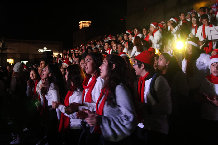 Aline Ortiz / La Voz de Michoacán Morelia, Michoacán. Este sábado, los morelianos disfrutaron de una noche de villancicos en la Plaza Valladolid, que armonizaban con los colores azul y blanco y un árbol navideño gigante que, como es tradición, cada año se instala en esta plaza. A través de la Secretaría de Turismo, el gobierno del estado y el Ayuntamiento de Morelia, se contó con la participación del Coro Monumental de Morelia, conformado por alumnos de la Universidad Jefferson, la Universidad de Morelia, Universidad Latina de América y la Universidad La Salle, entre otras, quienes conmovieron a los asistentes con un recital en el que interpretaron 14 villancicos. En la Plaza Valladolid se realizó el encendido del tradicional árbol de Navidad. Video: Víctor Ramírez. El coro abrió el recital con "Navidad en cada quien", "Navidad sin guerra", "Vamos juntos", "Blanca Navidad", "Los peces en el río", "Campana sobre campana", "Los pastores a Belén", "El niño del tambor" y "Noche de paz". El rector de la Universidad La Salle, Jesús Vázquez, señaló que "con la esperanza de la renovación y en tan significativo momento de la historia del hombre, queremos cantar a la Navidad. Es la buena noticia que hace renacer al amor año tras año. Un batallón de voces que levantan su espíritu para anunciar que el hijo de Dios está por llegar. Las incesantes amenazas de la guerra y la lucha del hombre con el hombre han sido una constante lamentable en nuestra historia. Por eso hoy, convertidos en un gran ejército de paz, todos nosotros levantamos la voz para gritar que queremos una Navidad sin guerra, un nuevo siglo de amor y una nueva era de armonía y concordancias entre los hombres". Como ya es costumbre, un concierto del Coro de las Mil Voces ambientó con una serie de villancicos la también conocida Plaza de San Francisco. Video: Enrique Santiago. Por su parte, el arzobispo de Morelia, Carlos Garfias Merlos, resaltó que "admirable signo nos ha regalado el papa Francisco como una carta extraordinaria que ha enviado a la Iglesia y al mundo, en la ocasión de este Adviento y Navidad que estamos celebrando. Ese signo admirable que el papa nos presenta ante nuestros ojos, que es el Belén, como se conoce en el mundo, y es el Nacimiento, como lo conocemos aquí en México. El nacimiento del hijo de Dios es el que da sentido a estos días, la presencia de Jesús Niño a quien hemos cantado, alabado, orado, y a quien nos acercamos estos días que preparan la Navidad. El papa nos recuerda la historia san Francisco de Asís, que nos acerca a las personas más humildes. El inicio de la tradición de los Belenes nos recuerda que debemos contemplar a Jesús y ver por los más pobres, los más abandonados, los que tienen hambre, los que tienen dolor y sufrimiento, los que son víctima de las violencias. Cobijemos a todos ellos". Foto, Víctor Ramírez. En tanto, el alcalde de Morelia, Raúl Morón Orozco aprovechó el micrófono para desear a todos los presentes una feliz Navidad. Para finalizar el evento, el coro concluyó con el tema "Color y esperanza". Posteriormente, chicos y grandes se mostraron admirados ante el espectáculo del árbol de Navidad, la música y los fuegos artificiales, con lo que formalmente inician los festejos navideños en la capital del estado. Además, alrededor de las 20:30 horas fue la inauguración del nacimiento gigante en la Plaza de Armas, a un costado de Catedral. Las figuras del nacimiento han sido elaboradas por artesanos de Capula. Y para las 21:00 horas se presenció el majestuoso encendido de dicho recinto religioso.