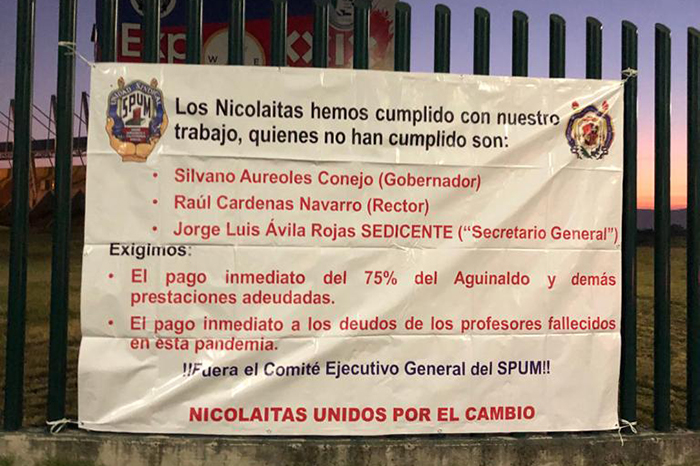 Juan Bustos / La Voz de Michoacán Morelia, Michoacán. Esta mañana, profesores universitarios se manifestaron en protesta por la falta de pago de sus prestaciones contractuales, en la que se destaca el 75% de su aguinaldo del año pasado. Los profesores acusan la inacción del Comité Ejecutivo General del SPUM, incluso que existe un contubernio con la rectoría y el gobierno del estado. Otra de las prestaciones que reclaman es la del pago de marcha a los deudos de los profesores que han sucumbido en esta pandemia. Aparte de esto piden la renuncia del Comité Ejecutivo General del SPUM. La acción de este día se realizó por movimiento denominado "Nicolaitas Unidos por el Cambio" es un movimiento más que se integra por profesores inconformes con el actuar del Comité Ejecutivo del sindicato. Con esto suman ya varios movimientos al interior de la universidad que manifiestan su inconformidad, ante la falta de pagos.