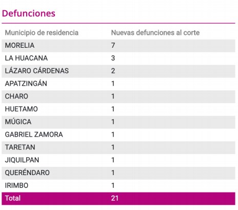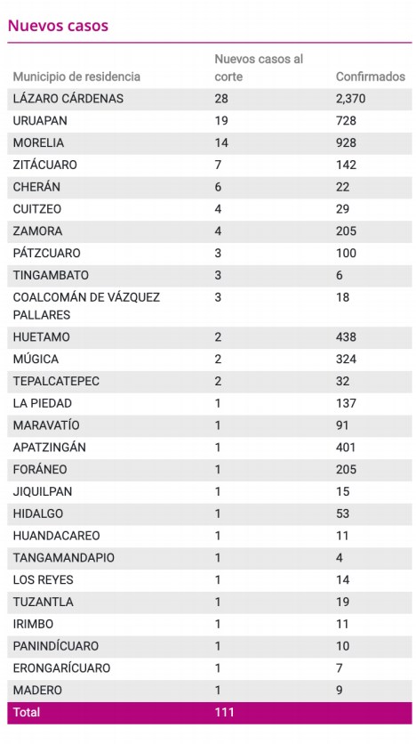 Casos acumulados Confirmados Recuperados Muertes Lázaro Cárdenas2,3702,007132Morelia92868170Uruapan72854358Huetamo43836126Apatzingán40134636Múgica32426648 La Voz de Michoacán te presenta todas las noches el último reporte de la Secretaría de Salud de casos de COVID-19 Osiris Olachea / La Voz de Michoacán Morelia, Michoacán. Lázaro Cárdenas, Uruapan y Morelia concentraron la mayoría de los 111 casos nuevos de COVID-19 que se registraron este martes en Michoacán, con los que suman 7 mil 464 casos confirmados en todo lo que va de la emergencia sanitaria, de acuerdo con el informe epidemiológico actualizado hoy por las autoridades sanitarias en la entidad. Este día 44 de la nueva normalidad o convivencia, en el estado se reportaron 21 decesos más, y con ellos se acumulan 586 defunciones. Hasta hoy 5 mil 848 personas se han recuperado del COVID-19, enfermedad causada por el virus SARS-CoV-2, lo que representa 78.35 por ciento del total de personas infectadas. En todo el estado hay mil 30 personas consideradas como casos activos, pues presentan síntomas como tos, dolor de cabeza, fiebre, dolor muscular y de articulaciones, por lo que son quienes pueden transmitir el virus a otros. Fuente: Centro Estatal de Operaciones COVID-19 de la SSM. Diseño: Enrique Santiago, La Voz de Michoacán. Lázaro Cárdenas reportó hoy 28 nuevos contagios, con lo que suman 2 mil 370 habitantes positivos a la nueva cepa de coronavirus, de las cuales 132 han muerto, 2 de ellas en las últimas horas. En el puerto michoacano 2 mil 007 personas se han recuperado al COVID-19, mientras que 231 son considerados casos activos, pues presentaron síntomas en los últimos 21 días. Además, hay 299 casos sospechosos que aún no reciben diagnóstico. Consulta toda la información por municipio aquí Uruapan tiene 19 casos positivos más, 728 en total, de los cuales 58 murieron, 543 ya vencieron a la enfermedad y 127 aún la padecen. En la 'Perla del Cupatitzio' hay 138 casos sospechosos. Con 14 personas más con COVID-19, Morelia llegó a 928 casos acumulados, y de ellos, 70 fallecieron, 681 superaron el padecimiento y 177 todavía están enfermos. Cherán, uno de los últimos municipios en presentar contagios, sumó hoy 6 casos y llegó a 22 en total, de los cuales 12 superaron la enfermedad, 10 aún luchan contra ella y 11 más son casos sospechosos. Fallecimientos Este martes se confirmó la muerte de 21 personas positivas a SARS-CoV-2, la mayoría de ellas en Morelia, con 7 decesos, La Huacana, con 3 y Lázaro Cárdenas con 2. Taretan, Charo y Queréndaro reportaron hoy su primer deceso, mientras que otros 6 municipios registraron también una defunción más este día: Apatzingán (36 en total), Huetamo (26 totales), Múgica (48 totales), Gabriel Zamora (3), Jiquilpan (2 en total) e Irimbo (3). Hasta hoy en Michoacán se han hecho análisis a 22 mil 314 personas en el estado, de las cuales 2 mil 226 permanecen como sospechosas y 12 mil 624 han dado negativo a la nueva cepa de coronavirus. Fuente: Dirección General de Epidemiología de la Ssa. Diseño: Enrique Santiago, La Voz de Michoacán.