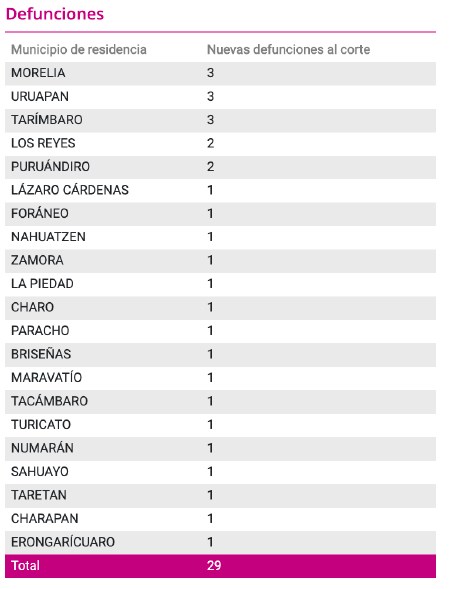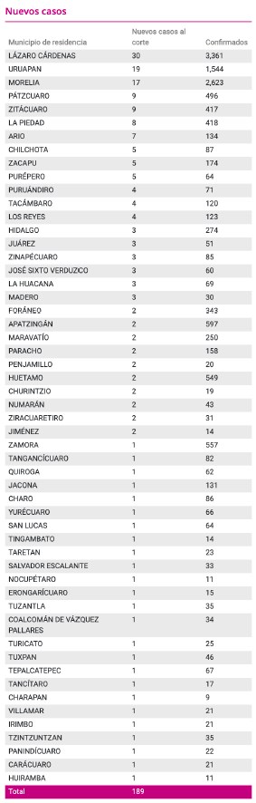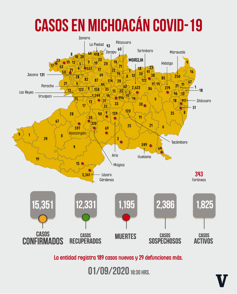 Casos acumulados Confirmados Recuperados Muertes Lázaro Cárdenas3,3612,936188Morelia2,6232,003186Uruapan1,5441,214139Apatzingán59750250Huetamo54949734Zamora55744460 La Voz de Michoacán te presenta todas las noches el último reporte de la Secretaría de Salud de casos de COVID-19 Jorge Manzo / La Voz de Michoacán Morelia, Michoacán. Al comenzar otro mes en la “nueva convivencia”, Michoacán reportó este primero de septiembre la cifra más alta de fallecimientos desde que comenzó la pandemia a finales de marzo, al registrar 29 defunciones de personas que no pudieron superar las complicaciones que les provocó la COVID-19. Sin embargo, la problemática ahí no para, debido a que más de mil 800 tienen activa la enfermedad y si no se aíslan podrían contagiar a más y crece el riesgo cuando infectan a quienes padecen obesidad, sobrepeso, diabetes o hipertensión, las principales causas de muerte. Asimismo, el Centro de Operaciones COVID-19 confirmó que otras 189 personas han dado positivo a la enfermedad, una vez que presentaron dolor de cabeza, tos seca, diarrea, pérdida de olfato y del gusto, así como fatiga, por lo que, al realizarse la prueba, los médicos tratantes ordenaron que se mantuvieran aislados, a fin de evitar que se disperse el coronavirus. Actualmente en la entidad hay 800 personas que han sido clasificadas como sospechosas debido a que presentaron los síntomas, y sólo se espera los resultados de los test. Morelia es el municipio con la mayor cantidad de casos activos, al sumar 434 pacientes. COVID-19 pega parejo La enfermedad no respeta a nadie. Si no se respetan las medidas básicas de higiene que comienzan con el uso del cubrebocas y la sana distancia, cualquier persona puede ser susceptible. En Michoacán, cinco presidentes municipales, dos diputados locales y decenas de policías, ministerios públicos, rescatistas y trabajadores en general del aparato gubernamental en los tres niveles de gobierno, han oficializado que son portadores de COVID-19, sin embargo, la cifra de burócratas infectados podría ser mayor, partiendo de que hay quienes serían asintomáticos, o quienes prefirieron guardar el secreto. Fuente: Centro Estatal de Operaciones COVID-19 de la SSM. Diseño: Enrique Santiago, La Voz de Michoacán. José Luis Cruz Lucatero, alcalde de Apatzingán, fue internado el fin de semana en el Hospital Militar de la 43 Zona Militar. Él presentaba problemas respiratorios y los síntomas que indicaban que era portador del nuevo coronavirus, sin embargo, fue hasta hoy que reveló que tras tres pruebas rápidas que le practicaron, dio positivo a la enfermedad que fue confirmada desde hace seis días. Él afirmó que su estado de salud es estable. Apatzingán actualmente se encuentra en bandera verde, lo que indica un riesgo controlado de la enfermedad, sin embargo, este municipio viene de una crisis que dejó como saldo 50 personas fallecidas y casi 600 personas contagiadas por el nuevo coronavirus. El Hospital de Zona del IMSS tuvo que ser ampliado debido a la alta demanda de servicios, mientras que el Hospital Regional comenzó a saturarse debido a la atención que presenta. En esa zona el Hospital Militar también tuvo que ser habilitado por la expansión del virus. Si bien se ha informado que el diputado Salvador Arvizu Cisneros se encuentra estable y ha presentado mejorías, él sigue internado en un hospital privado. De acuerdo con informes, el coronavirus se desarrolló con gravedad, por lo que fue necesaria la intervención de especialistas para auxiliarle a respirar mediante ventilación mecánica. Cabe mencionar que días antes él había informado que también había sufrido por dengue. Él incluso asistió a reuniones de la Junta de Coordinación Política, lo que despertó temor entre los legisladores, quienes valoraron la posibilidad de que todos fueran sometidos a una revisión médica, con cargo al erario. Más tarde, la diputada Lucila Martínez también confirmó que dio positivo a la enfermedad, por lo que aún se mantiene aislada esperando a que sea dada de alta. El primero en la lista El primer presidente municipal que dio a conocer que había resultado contagiado por COVID-19 fue el petista Martín Samaguey Cárdenas. Previamente había tenido actividades públicas en Zamora, por lo que una vez que se presentaron los síntomas se practicó la prueba, que terminó por confirmar la enfermedad. Ese municipio actualmente tiene 566 casos positivos y 59 defunciones y se encuentra con banderas amarillas. Hace unas semanas, en ese municipio se había ordenado la apertura de negocios, pero más tarde, se retractaron debido a que contravenía a las disposiciones sanitarias que advertían un riesgo. El edil de Pátzcuaro, Víctor Manuel Báez Ceja, también fue contagiado por COVID-19. Justo un día después de que encabezó una campaña de promoción del uso del cubrebocas, informó a través de sus redes sociales que había dado positivo al nuevo coronavirus. Ese municipio ha sido golpeado duramente por la contingencia, no sólo porque las actividades turísticas –una de sus principales fortalezas económicas- se ha visto reducida, sino también porque la enfermedad se ha distribuido de manera acelerada. Consulta aquí los casos por cada municipio Actualmente en ese pueblo mágico se han registrado 487 casos positivos y 38 defunciones. Ese municipio se encuentra en estos momentos en bandera amarilla, por lo que el riesgo sigue siendo alto, y siguen aplicándose las medidas de sanidad debido a que la población es susceptible de contagios. La tasa de letalidad es del 7.8 por ciento. Él no requirió de ser internado, y sólo se mantuvo aislado en casa, con prescripción médica. El edil de Gabriel Zamora, Jorge Gutiérrez Sánchez, también resultó positivo a esta enfermedad contagiosa, incluso, se ordenó el cierre de las oficinas de gobierno. El municipio se encuentra en bandera verde con 40 casos positivos y 8 defunciones. La tasa de l