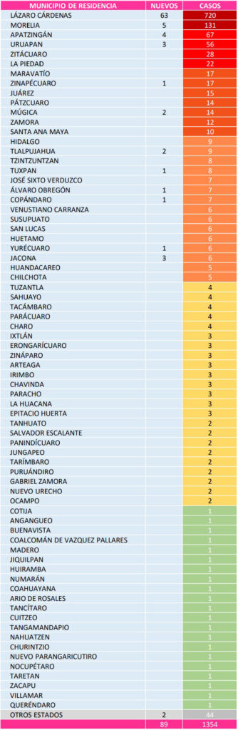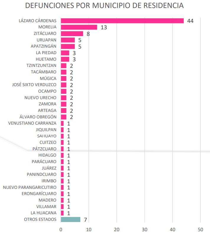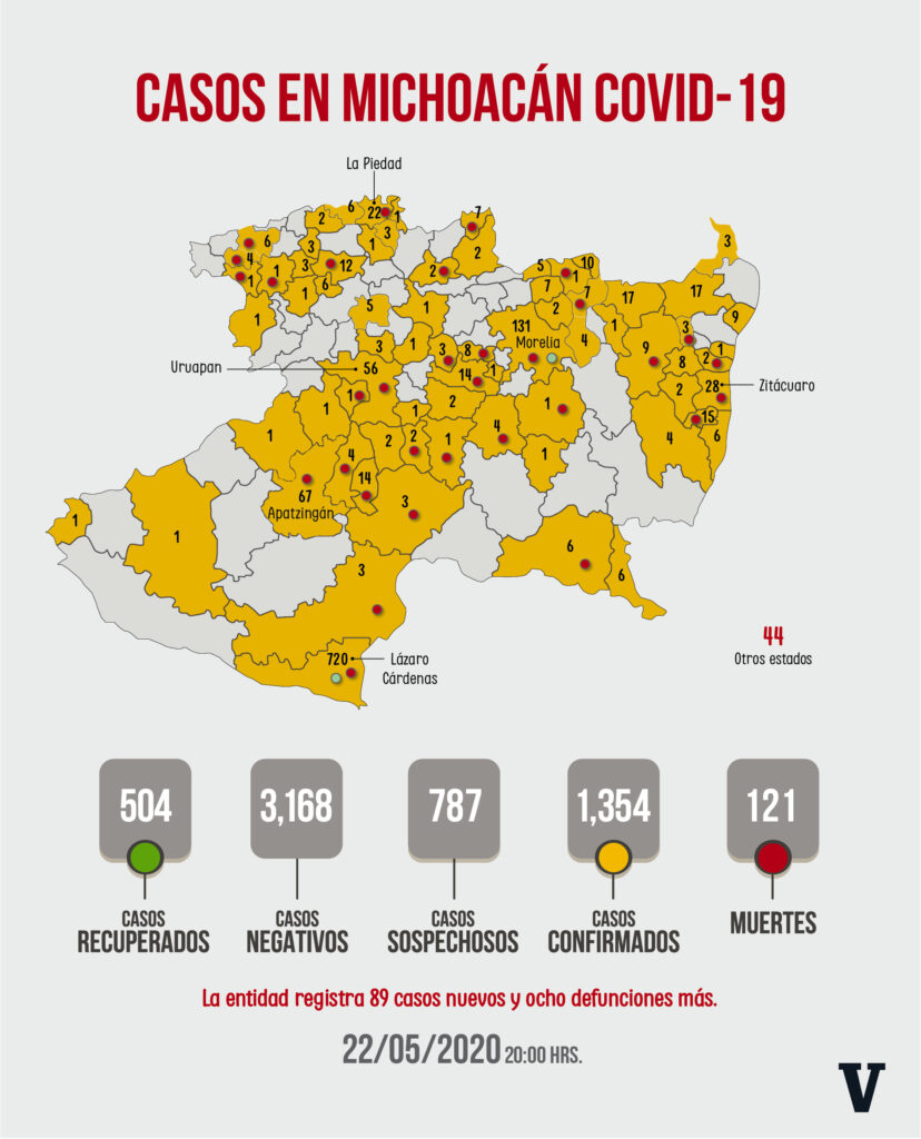 La Voz de Michoacán te da a conocer todas las noches el último reporte de la Secretaría de Salud. Osiris Olachea / La Voz de Michoacán Morelia, Michoacán. Morelia, Villamar, Uruapan, Hidalgo, Lázaro Cárdenas, Zitácuaro Múgica y Huetamo son los municipios donde residían las 8 personas que murieron en el transcurso del último día por complicaciones de la enfermedad de COVID-19, de acuerdo con el informe del Comité Estatal de Seguridad en Salud (CESS), órgano conformado por autoridades estatales y federales para la atención a la epidemia por el nuevo coronavirus en Michoacán. En total en la entidad han muerto 121 personas por la enfermedad causada por el virus SARS-CoV-2, la mayoría de ellas en Lázaro Cárdenas, con 44 defunciones, municipio que hoy suma 63 contagios más y llega a 720 habitantes infectados, es decir, 53 por ciento de todos los casos en Michoacán. Fuente: Departamento de Epidemiología de la SSM. Diseño: La Voz de Michoacán. Morelia llegó a 131 habitantes positivos a la nueva cepa de coronavirus, de los cuales 5 se detectaron en las últimas horas. En la capital del estado han ocurrido 13 defunciones por este padecimiento, la más reciente fue notificada hoy. Con 4 nuevos contagios, Apatzingán alcanzó los 67 casos acumulados, y de estos murieron 5; este municipio es el tercero con más personas enfermas de COVID-19 y el cuarto con más decesos, junto con Uruapan, que tiene el mismo número de fallecimientos, con 4 casos. La ‘Perla del Cupatitzio’ llegó a 56 casos en total, 3 de ellos detectados en las últimas horas, misma cantidad de contagios nuevos que Jacona, que suma 6 habitantes con COVID-19. Las autoridades sanitarias en el estado reportaron que en Múgica 2 habitantes más fueron confirmados con el virus, los que actualizan a 14 la cifra de infectados en ese municipio, mientras que con 2 casos más, Tlalpujahua llegó a 9 contagios. El resto de los municipios en los que la Secretaría de Salud reportó casos nuevos de COVID-19 este viernes, con un contagio más cada uno, son Zinapécuaro (17 total), Tuxpan (8 total), Álvaro Obregón (7 total), Copándaro (7 total) y Yurécuaro (6 total). Además se informó que otros dos habitantes de diferentes estados dieron positivo al coronavirus, pero son atendidos en Michoacán, por lo que entran en el reporte estatal de casos. El número de pacientes que están hospitalizados por alguna complicación de la enfermedad es de 53, de los cuales 41 están graves, indica el reporte de las autoridades sanitarias en el estado. Hasta hoy 5 mil 309 personas han sido sometidas a pruebas para detectar el virus, 238 más que ayer, de las cuales 787 se mantienen sin diagnóstico, es decir como casos sospechosos, y 3 mil 168 han dado negativo al estudio. Del total de personas con COVID-19 en el estado, 817 son hombres y 537 mujeres. El paciente de mayor edad con la enfermedad es una persona de 96 años y la más joven es un bebé que aún no cumple el año. Defunciones Dos municipios reportan la mayoría de las muertes por complicaciones de la enfermedad de COVID-19 en Michoacán: Lázaro Cárdenas, con 44 casos, más de un tercio de los decesos totales, y Morelia, con 13 pacientes que perdieron la vida y que representan 10.7 por ciento de todas las defunciones. Estos dos municipios son además los que tienen el mayor número de personas enfermas, Lázaro Cárdenas concentra por sí solo 53 por ciento de la enfermedad en el estado. El tercer municipio con más muertes es Zitácuaro, con 8, y después están Uruapan y Apatzingán, con 5 decesos cada uno. De los 22 pacientes con el virus en La Piedad, 3 han fallecido, al igual que en Huetamo, donde han muerto 3 de sus 6 habitantes contagiados. Otros 9 municipios reportan 2 defunciones de personas que tenían coronavirus y desarrollaron la enfermedad de COVID-19, mientras que 15 tienen solo un fallecimiento. Fuente: Dirección General de Epidemiología de la Ssa. Diseño: La Voz de Michoacán.