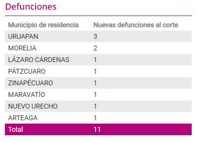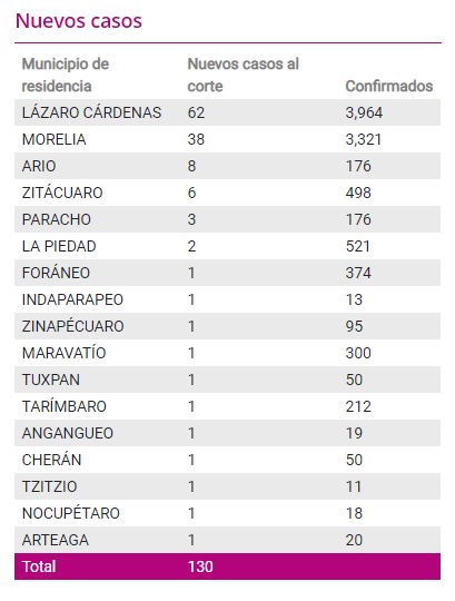 Casos acumulados Confirmados Recuperados Muertes Lázaro Cárdenas3,9643,328210Morelia3,3212,604253Uruapan1,8221,507173Apatzingán66957055Zamora63952266Pátzcuaro62450948 La Voz de Michoacán te presenta todas las noches el último reporte de la Secretaría de Salud de casos de COVID-19 Osiris Olachea / La Voz de Michoacán Morelia, Michoacán. En las últimas 24 horas se registraron en Michoacán 130 contagios nuevos y 11 decesos más de pacientes con COVID-19, de acuerdo con el corte epidemiológico actualizado este jueves por las autoridades sanitarias en la entidad. Hasta hoy, Michoacán acumula 18 mil 358 casos confirmados de la enfermedad y mil 457 defunciones ocurridas en los cinco meses y medio que lleva la entidad en epidemia. Son ya más de 15 mil las personas que se han recuperado a la enfermedad, lo que equivale a 82 por ciento de todas las personas que dieron positivo al virus SARS-CoV-2 en el estado. Sin embargo, hay mil 819 casos activos en todo Michoacán, es decir, son las personas que comenzaron a presentar los síntomas propios de la enfermedad en los últimos 21 días, tiempo considerado por la Secretaría de Salud como en el cual pueden contagiar a otros. Además, hay 2 mil 71 casos sospechosos, es decir, personas que podrían haberse infectado con la nueva cepa de coronavirus, pero no han recibido los resultados de laboratorio para descartarlo o confirmarlo. Lázaro Cárdenas es el municipio con más casos nuevos este día: tiene 62 más y 3 mil 964 en total, de los cuales 3,328 se han recuperado, 210 murieron, 426 aún están enfermos y 243 son casos sospechosos. Morelia registró 38 contagios más y con ellos llegó a 3 mil 321 casos acumulados, la mayoría de ellos ya recuperados, con 2 mil 604 habitantes que ya superaron la COVID-19. Ve aquí los casos en tu municipio Sin embargo, en la capital del estado hay 464 personas que en estos momentos batallan contra la enfermedad, por lo que pueden contagiar a otras personas, además de que se cuentan 638 habitantes más que podrían haberse contagiado y no lo saben. En el municipio de Ario 8 personas más dieron positivo a coronavirus, y con estos hay en total 176 casos acumulados, de los cuales 5 han muerto, 147 vencieron a la enfermedad, 24 todavía batallan contra ella y 22 más son casos sospechosos.