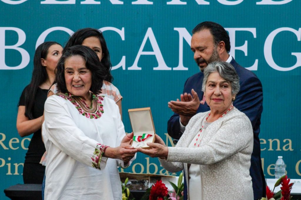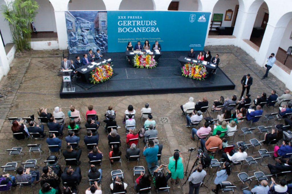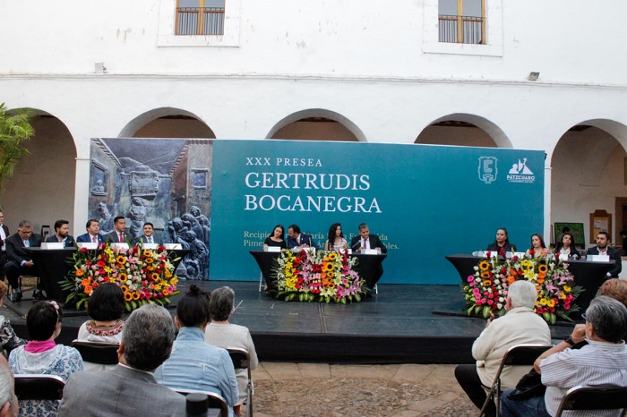Pátzcuaro, Michoacán.-En sesión solemne de Cabildo el Ayuntamiento de Pátzcuaro condecoró con la Presea “Gertrudis Bocanegra” en su XXX Edición a María Magdalena Esmeralda Pimentel Escobar, así como a Ángeles García Robles, en representación del “Patronato pro rescate y restauración del Centro Cultural Ex Colegio Jesuita de Pátzcuaro”. Lo anterior en reconocimiento a su labor ejemplar de gestión y organización ciudadana para la recuperación y habilitación como centro cultural del inmueble, en el periodo comprendido entre 1990 y 1998, además del esfuerzo y dedicación ejemplar de los integrantes de este Patronato para el desarrollo del quehacer artístico y cultural de la región. Durante la sesión en representación del gobernador, Alfredo Ramírez Bedolla asistió la secretaria de Cultura, Tamara Sosa Alanís quien reconoció este gran trabajo que logró tener un espacio digno lleno de historia para desarrollar el talento artístico. Por su parte el presidente Municipal, Julio Arreola Vázquez resaltó que hoy se le reconoce a dos mujeres patzcuarenses sumamente valiosas, quienes formaron parte de este proyecto de pro rescate y restauración de un lugar tan icónico como lo es el antiguo convento Jesuita de Pátzcuaro. Resaltó que, esta Presea es el máximo galardón que entrega el gobierno de Pátzcuaro a mujeres destacadas del municipio. LA PRESEA Desde el 11 de agosto de 1993, se aprobó en sesión de cabildo la institución de la presea Gertrudis Bocanegra, con el fin de honrar a la heroína patzcuarense y hacer un reconocimiento a las mujeres que han puesto en alto el nombre de Pátzcuaro, Michoacán y México. Por Decreto, del Congreso del Estado, de 10 de febrero de 1994, fue aprobada la institución de este galardón y se facultó al ayuntamiento para entregarlo el 11 de abril de cada año. Durante estos 30 años de trayectoria, Pátzcuaro ha reconocido a 8 activistas sociales, 4 historiadoras, 3 organizaciones sociales, 3 profesoras, 2 escritoras y en una ocasión a una actriz, una médico tradicional, una asociación religiosa, una artista, una periodista, una escultora, una benefactora y una deportista; en 2010 fue otorgada en doble reconocimiento a una historiadora y una profesora y en dos ocasiones fue declarada desierta.
