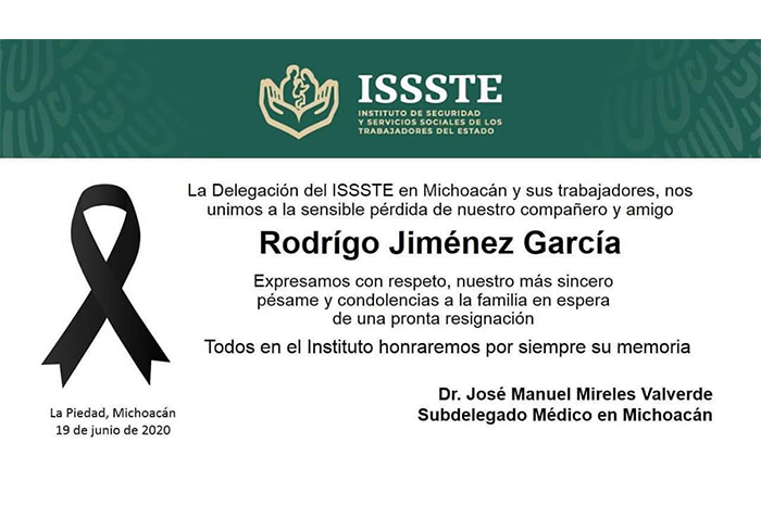 Redacción / La Voz de Michoacán Morelia, Michoacán. El director de la clínica del Instituto de Seguridad y Servicios Sociales de los Trabajadores del Estado (ISSSTE) de La Piedad, el doctor Rodrigo Jiménez García, falleció este viernes en la ciudad de Morelia, víctima de COVID-19. El médico fallecido fue el primero en el frente de batalla contra la epidemia en Michoacán, pues atendió al primer paciente con COVID-19 en el estado, aseguró el subdelegado médico del ISSSTE en la entidad, José Manuel Mireles Valverde. Hace apenas unos días, el mismo doctor informó que había dado positivo al examen de laboratorio que se practica a los sospechosos de SARS-CoV-2 y la mañana de este viernes se confirmó por parte de su familia que había perdido la batalla contra el coronavirus. El médico y director encargado de hacer toma de muestras COVID-19 en la clínica de La Piedad fue internado en un hospital de la ciudad de Morelia, donde su situación se fue agravando hasta terminar entubado. La confirmación se hizo en su muro de Facebook, donde se hacen reconocimientos al doctor que llegaba a la clínica que dirigió, para ponerse el atuendo adecuado y atender a los pacientes con sospecha de esta enfermedad, a los que atendía de manera oportuna. Con información de La Redacción