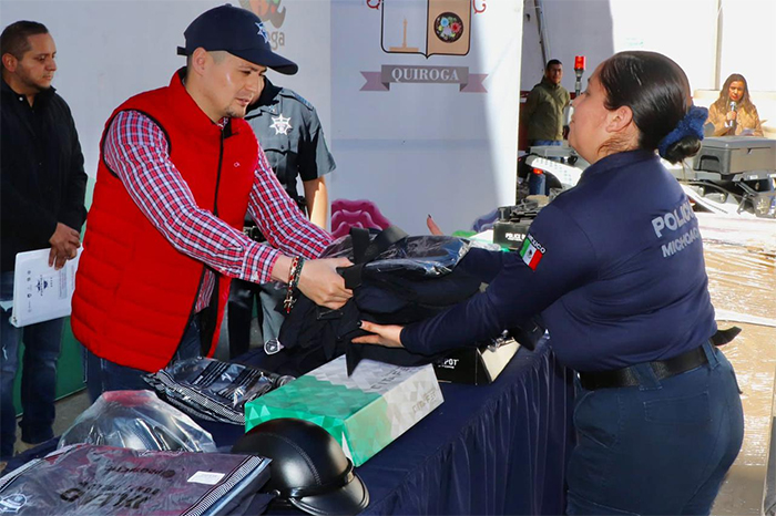 Redacción / La Voz de Michoacán Quiroga, Michoacán. Esta mañana el presidente municipal, Arturo Estrada Barriga, hizo entrega de equipo del programa estatal Fondo de Fortalecimiento para la Paz (FORTAPAZ), con el objetivo de que la policía de Quiroga cuente con más infraestructura para mejorar su imagen y su desempeño en bien de la seguridad de las y los habitantes de nuestro municipio. Se hizo entrega de uniformes para elementos acreditados, una laptop, impresora multifuncional, dos cascos para motocicleta, remodelación del área de barandilla, dos cuatrimotos, una unidad policial pick up. “Es digno de presumir que somos uno de los municipios más seguros de todo el estado con estadísticas y números fríos que se han dado a conocer, hemos ido a la baja en su totalidad de delitos de alto impacto, como los homicidios, secuestros, extorsiones, entre otros. Quiroga es el municipio más seguro de la región y uno de los más seguros del estado, gracias a las labores de logística preventiva que hemos aplicado en la presente administración “, dijo satisfecho de estar entregando buenas cuentas a su pueblo el munícipe.
