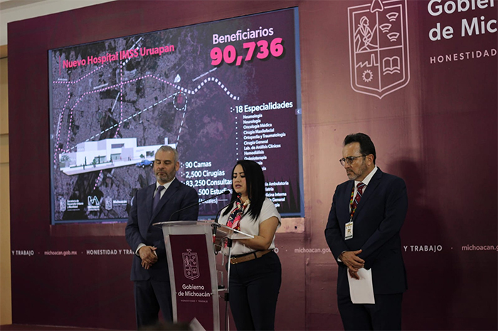 Redacción / La Voz de Michoacán Morelia, Michoacán. El nuevo hospital del IMSS en Uruapan tendrá un beneficio para más de 190 mil derechohabientes de una macro zona que incluye a 10 municipios, y estará listo para junio del próximo año, anunció el gobernador del estado, Alfredo Ramírez Bedolla. Este martes, en el encuentro del mandatario estatal con medios de comunicación, la secretaria de Desarrollo Urbano y Movilidad Gladyz Butanda, desglosó que este hospital tendrá 90 camas y se contempla realizar de manera anual 2 mil 500 cirugías, 83 mil 250 consultas, 792 mil 500 estudios; además de que contará con 18 especialidades, como ningún otro hospital fuera de la capital michoacana. Los municipios que tendrán beneficio son Uruapan, Nahuatzen, Nuevo Parangaricutiro, Paracho, Tancítaro, Taretan, Tingambato, Charapan, Cherán, Chilchota. La servidora pública detalló que el terreno de 4 hectáreas para construir el nosocomio se adquirió en 70 millones de pesos, a tarvés de Fidemich. La inversión total es de 1.1 mil millones de pesos, de los cuales, 551 millones de pesos se ejecutarán en 2023 y 560 millones de pesos en 2024. Por su parte, el delegado del IMSS en Michoacán, José Miguel Ángel Van Dick Puga, indicó que como es una expansión de servicios, el beneficio no será solo para 90 mil derechohabientes de Uruapan, sino para más de 190 mil de toda la zona. “En pocas palabras en esa macrozona estaremos abatiendo toda la carencia de camas, tendremos de más”. Ramírez Bedolla destacó que se triplicará la capacidad hospitalaria, “que había estado en el abandono total de manera vergonzante, porque Uruapan tiene más de 600 mil habitantes, es el motor económico más fuerte del estado, pero no había correspondencia del gobierno federal”.
