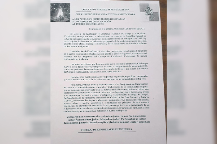 Angélica Ayala / La Voz de Michoacán Pátzcuaro, Michoacán. Por el incremento de contagios por la COVID-19, el Consejo del Kurhíkuaeri K´uínchekua (Consejo del Fuego y Año Nuevo P’urhépecha) determinó que en la ceremonia del encendido del fuego en el centro ceremonial de Ihuatzio solamente podrán participar los integrantes del mismo, y recibirán a pequeñas comisiones de otras comunidades que tienen la intención de proponerse para la sede de 2023, es así que no estará abierta al público en general. Esta celebración, considerada como de las más importantes de los pueblos purépechas de Michoacán, se realizará con un aforo controlado, en las Yácatas de Ihuatzio, centro ceremonial que determinó el Consejo del Fuego Nuevo tras los problemas que originaron dos grupos de personas de la comunidad de Comanja, lugar sede desde 2021; sin embargo, por la pandemia se canceló y ahora este año le retiran la celebración por la división que generaron al interior del poblado. El Consejo de Kurhíkuaeri K'uínchekua aclaró que son autónomos e independientes, y que fue en una asamblea general y en acuerdo con los jefes de tenencia, comisariados de bienes comunales y jueces tradicionales de la comunidad de Ihuatzio, municipio de Tzintzuntzan, que ante el incremento de casos de contagio por el coronavirus, y con el propósito de disminuir la cadena de contagio, la celebración “no será abierta al público en general, únicamente será realizada por los integrantes del Concejo de Kurhíkuaeri K´uínchekua de manera representativa y simbólica”. La celebración que se realizará este próximo martes 1 de febrero en punto de la media noche, cuando la constelación de Orión está en el cenit, es cuando los cargueros prenden el Fuego Nuevo para dar la bienvenida al nuevo año purépecha, así como el inicio del ciclo agrícola. Informaron que “las únicas actividades que llevarán a cabo son la ceremonia de renovación del Fuego Nuevo e inicio del Año Nuevo p’urhépecha, así como la designación de la nueva sede de 2023, por lo que pedimos a las comunidades que deseen solicitar la sede, que acudan a la reunión del Concejo Kurhíkuaeri K´uínchekua en comisiones reducidas”. Por medio de un documento, el Consejo del Kurhíkuaeri K´uínchekua informó de la determinación tomada. Foto, Samuel Herrera Jr. Es así que el Consejo Kurhíkuaeri K´uínchekua pide a los pueblos originarios y al público en general que comprendan y acaten la decisión de reducir el aforo de participantes en la celebración. “Rogamos a los pueblos originarios y al público en general que por favor comprendan que estas medidas son con el fin de evitar más contagios en las comunidades p’urhépecha”. A la vez, hacen un llamado a los excargueros del Fuego Nuevo, así como a las autoridades civiles, comunales y tradicionales de los pueblos indígenas de las cuatro regiones de Michoacán: Ciénega de Zacapu, Región Lacustre, Cañada de los Once Pueblos y Meseta Purépecha, que, observando las medidas sanitarias correspondientes, “celebren en sus respectivas comunidades el inicio del año nuevo p’urhépecha y que el fuego nazca, crezca y se expanda por las cuatro regiones p’urhépecha. “Así como en la diáspora p’urhépecha, manteniendo viva llama de nuestra historia, nuestra cultura y nuestra cosmovisión, y respetando los principios de esta ancestral celebración: no se permite la intromisión de los partidos políticos, ni la participación de las religiones occidentales o la intervención de instituciones gubernamentales o privadas. Es una celebración originaria, autónoma e histórica del pueblo p'urhépecha”, acotan el texto. Es de señalar que será en medio de las Yácatas de Ihuatizo que se realizará el encendido del Fuego Nuevo respetando los lineamientos que marca el Instituto Nacional de Antropología e Historia (INAH), además, el Consejo del Kurhíkuaeri K´uínchekua estará recibiendo las solicitudes de las comunidades que se propongan para ser la nueva sede de 2023. Mientras que el Fuego Abuelo permanecerá en la comunidad de Capacuaro, lugar donde también fueron depositados los símbolos purépechas, ante el agravio en Comanja, donde permanecerá durante este año hasta ser trasladado a la siguiente sede; sin embargo, los símbolos purépechas sí serán trasladados a Ihuatzio, ya que son parte fundamental para el encendido del Kurhíkuaeri K´uínchekua.