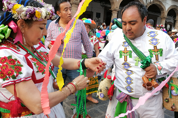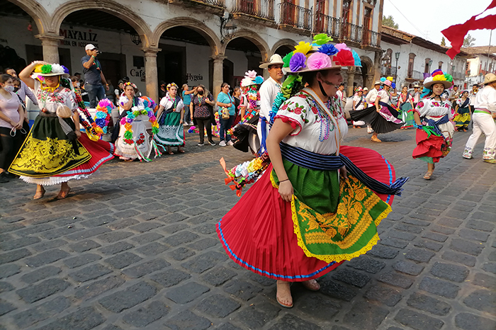 Angélica Ayala / La Voz de Michoacán Pátzcuaro, Michoacán. Para celebrar el Día de la Santa Cruz, en Pátzcuaro se realizan dos actividades muy tradicionales: la primera es a temprana hora, cuando los trabajadores de la construcción suben al Cerro Blanco llevando consigo sus cruces forradas de colores y con flores, para ahí participar en una celebración eucarística y ser bendecidas las cruces por el sacerdote; le sigue la fiesta del Barrio de la Cruz Verde, que al haber sido suspendida por dos años consecutivos por la pandemia retomó esta festividad. La tradición de la fiesta de la Cruz Verde, que tiene como centro principal los bailes tradicionales con las guares y guachos que se visten con los trajes regionales y bailan al son de la música de banda, han rescatado y respetado los pasos tradicionales; además, durante el recorrido que realizan por la tarde presentan costumbres como una boda purépecha, el torito de carnaval, la danza del pescado, el corpus, entre otras más. Se cuenta que la Cruz Verde está hecha de una sola pieza, es decir que hace siglos los pobladores cortaron un gran árbol y de ahí sacaron la Cruz, misma que duró mucho tiempo fresca como si estuviera recién cortada. Cuentan que al entrar a la capilla donde estaba colocada la cruz se mantuvo fresca como recién cortada, al parecer fue en el siglo XVI cuando se elaboró la cruz, con el paso de los años, el encargado del templo la pintó toda de verde y así permanece en la actualidad. Foto, Angélica Ayala. La devoción a la Cruz Verde la iniciaron los purépechas de la ribera del Lago de Pátzcuaro, ya que la calle Obregón era su paso para llegar al mercado antes de ir a vender sus productos. Entonces llegaban a visitar a la Cruz y le pedían tener buenas ventas. También hay quienes señalan que llegaban para pedirle un buen temporal y obtener buenas cosechas, ahora las danzas que presentan las nuevas generaciones rememoran esta petición. Uno de los recorridos de las guares y los guachos, todos vestidos con la ropa regional y tradicional de los pueblos purépechas del Lago de Pátzcuaro, es por la tarde, cuando caminan y bailan por las calles del centro histórico ante la mirada de los transeúntes que se acercan para verlos pasar y bailar. Ellos representan bailes con los pasos originales que han sido heredados de una generación a otra, los acompañan los campesinos con las yuntas de bueyes que adornan sus cuernos con flores de papel blanco y verde para pedirle a Dios que haya un buen temporal y unas buenas cosechas. En lo que respecta a la caminata hacia la cima del Cerro Blanco, donde se encuentra una gran cruz que data de 1918, esta celebración es una tradición para las familias de albañiles, principalmente, acuden a la misa católica, llevando consigo las cruces que forran con papeles de colores y con flores del mismo material, desde antes de las 07:00 de la mañana empiezan a subir para lograr un buen lugar, cerca del altar donde el sacerdote llega a oficiar la celebración eucarística. Foto, Angélica Ayala. Al terminar es común que las familias se queden en las faldas del cerro para festejar a los albañiles. Como un día de campo, se ve a todos conviviendo, comiendo tostadas, tortas, tacos, fruta, corundas, hay quienes llevan su anafre y carbón para calentar los alimentos que llevan, sin faltar la cerveza bien fría, el tequila y los refrescos. Se cuenta que la cruz que se instaló en la cúspide del Cerro Blanco fue para bendecir a toda la región Lacustre, ya que desde su altura se puede observar todo el Lago de Pátzcuaro, sus islas y comunidades que integran a los cuatro municipios, Pátzcuaro, Tzintzuntzan, Quiroga y Erongarícuaro. No hay un año que marque el inicio de la tradición de subir al cerro y celebrar la misa, sin embargo, la fe de las personas hace que caminen y lleguen a la cima a escuchar el sermón del sacerdote que, al concluir la celebración eucarística, les bendice las cruces que llevan, incluso hay quienes llegan de los municipios aledaños como Salvador Escalante y Tzintzuntzan. Foto, Angélica Ayala.
