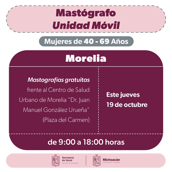 Redacción / La Voz de Michoacán Morelia, Michoacán.- Octubre el mes de la sensibilización sobre el cáncer de mama, siendo este uno de los tipos de cáncer con mayor numero de muertes en el país. El primer miércoles del mes es considerado el día nacional de la reconstrucción mamaria desde el 2020 por el Diario Oficial de la Federación. “Este día es una oportunidad para reconocer la fuerza y resiliencia de las valientes mujeres que han pasado por una mastectomía y han optado por la reconstrucción mamaria” menciono la Secretaría de Salud de Michoacán (SSM) en sus redes sociales. El cáncer de mama contemplado como primera causa de muerte en el país; la Secretaría Salud se dispone a brindar jornadas gratuitas para detección oportuna y apoyo a mujeres morelianas de 40 a 65 años, que requieran de una mastografía gratuita, podrán solicitarla sin cita en el centro de salud de Morelia “Dr. Juan Manuel González Urueña”, de la SSM. Todas las interesadas deberán presentar una copia de la identificación oficial con fotografía o Clave Única de Registro de Población (CURP), y acudir aseadas, con axilas rasuradas, sin crema corporal, talco o perfume. Durante todo el mes de octubre se estará invitando a diferentes actividades, comenzando con la ya mencionas mastografías gratis, caminatas y bazares No olvidemos que el cáncer puede prevenirse implementando cuidados y modificando factores de riesgo: Llevar una alimentación balanceada Disminuir el consumo de azúcares y grasasPracticar ejercicio al menos 30 minutos diariamenteEvitar el cigarro y el alcoholRealizar una autoexploración mamaria mensual Solicitar una mastografía a partir de los 34 años, en caso de antecedentes familiares de la enfermedad. Si no se tienen, se debe hacer cada dos años a partir de los 40 y cada año al llegar a los 50.