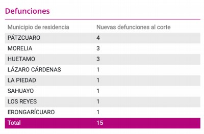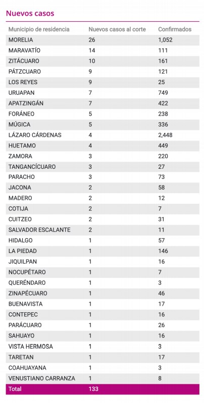 Casos acumulados Confirmados Recuperados Muertes Lázaro Cárdenas2,4482,072135Morelia1,05277975Uruapan74958258Huetamo44938930Apatzingán42235836Múgica33627949 La Voz de Michoacán te presenta todas las noches el último reporte de la Secretaría de Salud de casos de COVID-19 Osiris Olachea / La Voz de Michoacán Morelia, Michoacán. Este viernes Michoacán registró 133 casos nuevos de COVID-19, la mayoría de ellos en Morelia, con lo que el estado alcanzó 7 mil 939 casos acumulados de la enfermedad, de acuerdo con el informe de la situación de la epidemia que emitieron este día las autoridades sanitarias. Este día 47 de la nueva normalidad o convivencia se reportaron 15 nuevos decesos de pacientes positivos a coronavirus, y con ellos, Michoacán llegó a 621 defunciones por complicaciones del padecimiento. Hasta hoy se han recuperado 6 mil 240 personas que tenían COVID-19, mientras que mil 078 aún padecen la enfermedad, por lo que deben mantener las medidas de aislamiento o prevención, en caso de que no estén hospitalizados, para evitar que continúe la cadena de contagios. Fuente: Centro Estatal de Operaciones COVID-19 de la SSM. Diseño: Enrique Santiago, La Voz de Michoacán. De acuerdo con la Secretaría de Salud en Michoacán (SSM), los casos activos son las personas que manifestaron inicio de síntomas en los últimos 21 días. Además, en el estado hay 2 mil 304 casos sospechosos, es decir que aún no reciben diagnóstico, por lo que de resultar positivos al virus SARS-CoV-2, causante de la enfermedad de COVID-19, podrían aumentar la lista de casos confirmados y activos. Por segundo día consecutivo, Morelia es el municipio que registró más casos nuevos. Este viernes sumó 26 contagios más, y con ellos llegó a mil 052 casos acumulados, de los cuales 779 se han recuperado, 198 todavía presentan la enfermedad y 75 murieron. Además, en la capital michoacana hay 484 casos sospechosos que aún no se determina si están infectados o no. Maravatío reportó hoy 14 casos más y con ellos alcanzó los 111 casos confirmados, y de ellos, 78 superaron al COVID-19, 32 todavía presentan síntomas, por lo que son los casos activos, y 1 persona falleció; en este municipio hay además 67 habitantes que podrían tener la enfermedad. Zitácuaro, uno de los 14 municipios con Bandera Amarilla por el riesgo alto de contagios, tiene hoy 10 casos más, 161 en total; de estos, 100 ya vencieron a la enfermedad, 43 todavía la padecen y 18 murieron. Pátzcuaro es el municipio que registró más muertes este día, con 4 casos más, 14 en total. El Pueblo Mágico sumó 9 contagios y tiene 121 acumulados, de los cuales 56 se recuperaron y 51 todavía presentan la enfermedad de COVID-19, cuyos síntomas principales son tos, dolor de cabeza y fiebre. En Morelia y Huetamo se reportaron 3 muertes más de pacientes positivos a coronavirus, pero mientras la capital del estado tiene 75 decesos en total, Huetamo llegó a 30. Otros cinco municipios acumularon 1 nuevo fallecimiento: Lázaro Cárdenas (135 en total), La Piedad (12 totales), Sahuayo (2 en total), Los Reyes (3 en total) y Erongarícuaro (3 totales). La mayoría de los decesos en Michoacán son en el grupo de 60 a 69 años de edad, en el cual han fallecido 109 hombres y 64 mujeres, seguido del grupo de entre 50 y 59 años, con 140 defunciones y el de 70 a 79 años, con 138 casos. Fuente: Dirección General de Epidemiología de la Ssa. Diseño: Enrique Santiago, La Voz de Michoacán.
