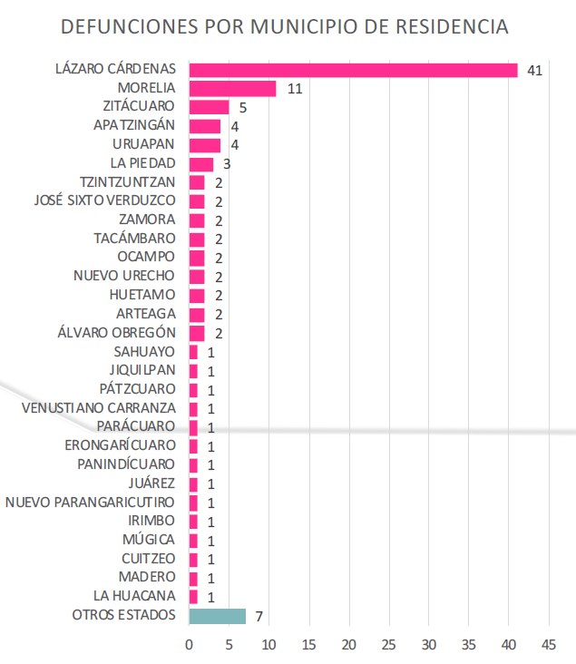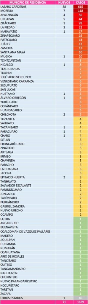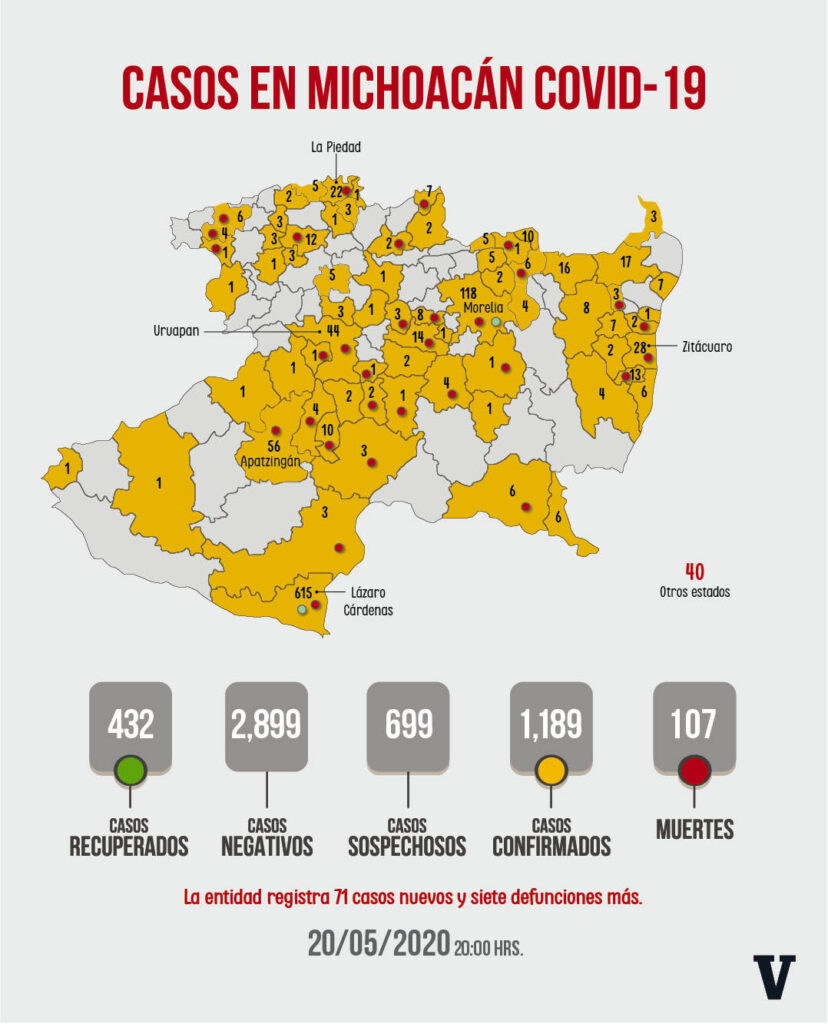 La Voz de Michoacán te da a conocer todas las nochesel último reporte de la Secretaría de Salud. Osiris Olachea / La Voz de Michoacán Morelia, Michoacán. Durante las últimas 24 horas 7 personas más murieron en Michoacán por complicaciones de la enfermedad de COVID-19, con lo que suman 107 defunciones en la entidad desde el inicio de la epidemia, de acuerdo con el reporte emitido hoy por el gobierno del estado. Las personas cuyo deceso se dio a conocer este día vivían en los municipios de Apatzingán, donde hubo dos muertes, así como Tacámbaro, Nuevo Urecho, Parácuaro, La Huacana y Ocampo, con una defunción en cada municipio. Además, hoy se registraron 71 nuevos casos, la mayoría en Lázaro Cárdenas, que continúa como el municipio con mayor transmisión del virus de SARS-CoV-2, que causa la enfermedad de COVID-19. En total Michoacán llegó hoy a mil 189 casos confirmados de la enfermedad. Fuente: Departamento de Epidemiología de la Secretaría de Salud. Diseño: La Voz de Michoacán. Con 38 contagios más, Lázaro Cárdenas llegó a 615 personas positivas al coronavirus, de las cuales han muerto 41; este municipio concentra 51.7 por ciento de la enfermedad en el estado. Morelia sumó 7 contagios más y 118 en total, con 11 defunciones, mientras que Apatzingán registró 4 nuevos pacientes con COVID-19 y llegó a un total de 56, con 4 fallecimientos. Uruapan tiene 5 personas más confirmadas con coronavirus, un total de 44 y 4 muertes; por su parte Zitácuaro cuenta con un contagio más y 28 acumulados, así como 5 decesos. Con 3 casos positivos más La Piedad alcanzó los 22 contagios, de los cuales 3 murieron, mientras que Chilchota sumó dos casos, 5 en total, y también con 2 nuevos Epitacio Huerta tiene enfermos a 3 de sus habitantes. El resto de los municipios con un caso nuevo reportado este miércoles son Maravatío, Múgica, Hidalgo, Huetamo, Álvaro Obregón, Tacámbaro, Parácuaro y Charo; además hay un paciente más de otro estado que es atendido en Michoacán, por lo que se contabiliza en el reporte local. Las muertes por COVID-19 no son exclusivas de los municipios que tienen más casos, pues incluso los que tienen pocos contagios ya registran decesos, de acuerdo con los reportes diarios de las autoridades estatales y federales encargadas de la atención a la epidemia en Michoacán. Tal es el caso de Tacámbaro, que hoy suma 4 casos confirmados, de los cuales 2 han muerto, o Parácuaro, que también tiene 4 pacientes con COVID-19 y uno de ellos ya murió. Los municipios que hasta hoy reportan 1 fallecimiento por coronavirus son Sahuayo, Jiquilpan, Pátzcuaro, Venustiano Carranza, Parácuaro, Erongarícuaro, Panindícuaro, Juárez, Nuevo Parangaricutiro, Irimbo, Múgica, Cuitzeo, Madero y La Hucana. Los que suman dos muertes son Tzintzuntzan, José Sixto Verduzco, Zamora, Tacámbaro, Ocampo, Nuevo Urecho, Huetamo, Arteaga y Álvaro Obregón. En el último día se practicaron pruebas a 202 personas en el estado para la detección de la nueva cepa de coronavirus, con lo que suman 4 mil 787 personas estudiadas, de las cuales 699 se mantienen como sospechosas, es decir sin diagnóstico, y 2 mil 899 han sido descartadas al dar negativo. Este miércoles se notificó la recuperación de 16 personas más y son 432 las que se han sobrepuesto a la enfermedad en el estado. Continúan hospitalizadas 51 personas más, 34 de ellas en estado de gravedad, según el informe de la Secretaría de Salud. De los mil 189 casos confirmados en la entidad, 59.8 por ciento son hombres, con 712 casos, mientras que las mujeres que han enfermado son 477.