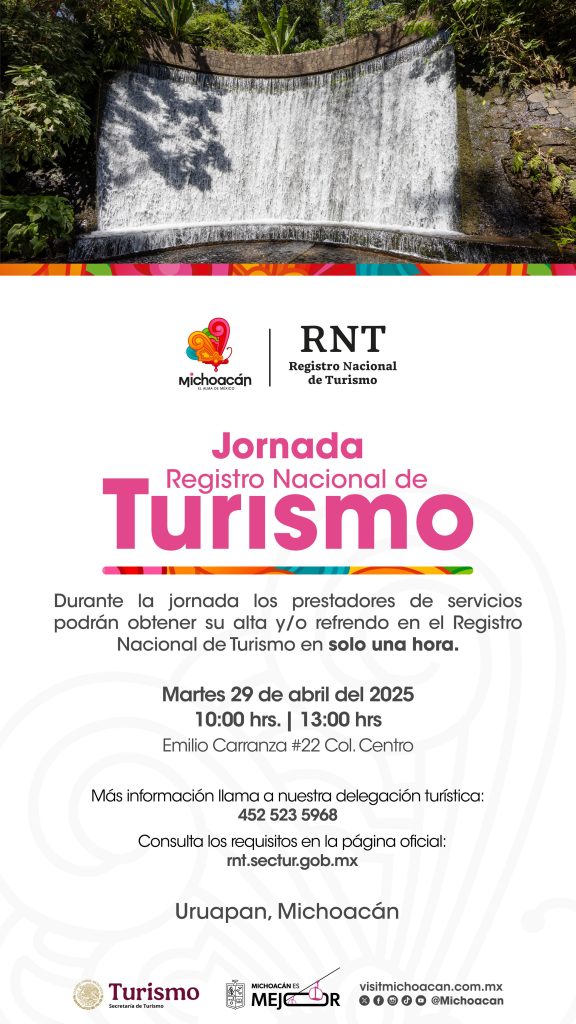 Morelia, Michoacán.- La Secretaría de Turismo de Michoacán (Sectur) anunció el comienzo de la jornada del Registro Nacional de Turismo (RNT), el cual permite a los prestadores de servicios del sector inscribirse o renovar su registro. La dependencia estatal encabezada por Roberto Monroy García, señaló que esta acción se realiza de acuerdo al artículo 48 de la Ley General de Turismo, ya que la inscripción al RNT es obligatoria para los Prestadores de Servicios Turísticos (PST). El primer municipio que se visitó fue Pátzcuaro, para posteriormente continuar este miércoles 23 de abril en Zitácuaro, encuentro que se desarrollará en la calle Revolución sur 358, colonia Flor de Liz, en punto de las 13:00 horas. Para acudir y tener mayor información las y los interesados se pueden contactar al número de teléfono 7151530675. El trámite es muy sencillo solo se debe reunir la documentación requerida y presentarla en formato PDF o enviarlos previamente al correo rnt.michoacan@gmail.com. Los requisitos completos se pueden consultar en la página oficial: rnt.sectur.gob.mx Los siguientes municipios que se visitarán son: Zamora, jueves 24 de abril; Uruapan, martes 29 de abril; Morelia, jueves 8 de mayo; Lázaro Cárdenas, 12 y 13 de mayo y Apatzingán 14 de mayo.