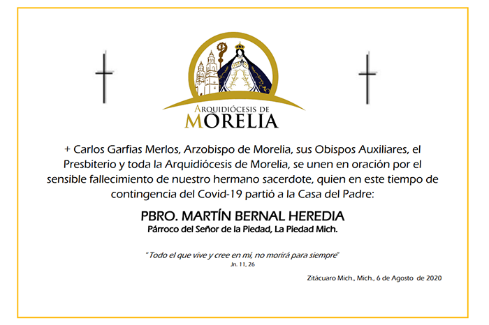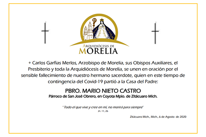 Redacción / La Voz de Michoacán Morelia, Michoacán. La Arquidiócesis de Morelia confirmó la muerte de dos sacerdotes más a causa de COVID-19. Se trata de los presbíteros Martín Bernal Heredia y Mario Nieto Castro. A través de esquelas, el arzobispo de Morelia, Carlos Garfias Merlos, los obispos auxiliares, el presbiterio y toda la Arquidiócesis de Morelia lamentaron el fallecimiento de los ministros “quienes en este tiempo de COVID-19 partieron a la Casa del Padre". El padre Martín, quien fue formador del Seminario Diocesano de Morelia, actualmente servía como párroco en el Santuario del Señor de La Piedad, en La Piedad, Mich., mientras que Mario Nieto estaba a cargo de la comunidad parroquial de san José Obrero, en La Coyota, municipio de Zitácuaro, Mich. El sacerdote Nieto Castro ya había padecido la muerte de su padre y su hermana también por la enfermedad del coronavirus. El pasado 5 de agosto rambién falleció el sacerdote Alfonso Espino García, quien estaba de residente en Valle de Santiago, de la diócesis de Irapuato, pero que aún pertenecía a la Arquidiócesis de Morelia. El 18 de junio, la iglesia diocesana de Morelia reportó el primer caso del deceso de uno de sus sacerdotes a causa de la enfermedad provocada por SARS-CoV-2, el P. Carlos López Aceves, originario de la piedad, quien desempeñaba su ministerio en la parroquia del Señor del Rescate, ubicada en la colonia Lomas del Valle, en la capital michoacana. Durante el mismo mes, el día 26, se dio a conocer que otro sacerdote perdió la vida por el mismo motivo, y aunque no era diocesano, era rector del Seminario de la Congregación de los Misioneros Servidores de la Palabra, en San Pedro de los Sauces, del municipio de Tarímbaro, Mich. Por su parte, en la diócesis de Tacámbaro, el 25 de junio se informó del fallecimiento del presbítero Francisco Javier Arteaga. Los sacerdotes fallecidos Pbro. Carlos López Aceves (Párroco del señor del Rescate en Morelia), 17 de junio de 2020Pbro. Francisco Javier Arteaga (Dióceis de Tacámbaro), 25 de junio de 2020Pbro. Víctor Ramírez Aguilar (Rector del Seminario de los Misioneros Servidores de la Palabra), 26 de junio de 2020.Pbro. Alfonso Espino García (residente en la parroquia de Valle de Santiago, Gto.), 5 de agosto de 2020.Pbro. Mario Nieto Castro (Párroco de San José Obrero, en la Coyota, Mpio. De Zitacuaro), 6 de agosto de 2020.Pbro. Martín Bernal Heredia (párroco del Señor de la Piedad), 6 de agosto de 2020.