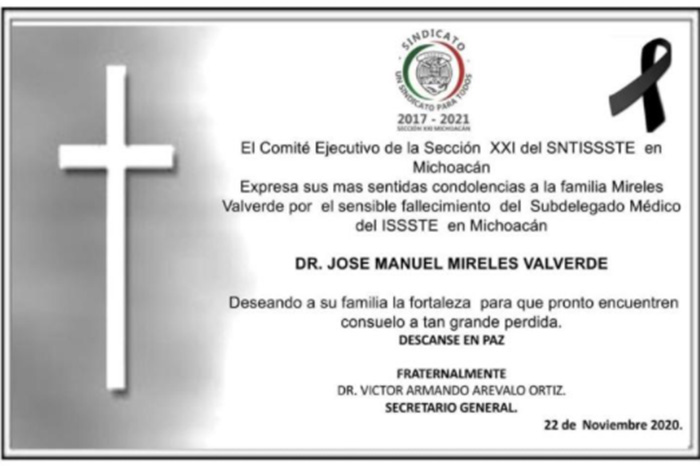 Redacción / La Voz de Michoacán Morelia, Michoacán. Luego de que circulara nuevamente la noticia de que el doctor José Manuel Mireles Valverde falleció tras varios días hospitalizado a causa de la enfermedad de COVID-19, fuentes de primera mano consultadas por este medio de comunicación desmintieron la información. Si bien el estado de salud del subdelegado del ISSSTE en Michoacán agravó durante los últimos días, las fuentes consultadas aseguran que sigue luchando contra la enfermedad. La noche de este domingo, diversas informaciones anunciaron el fallecimiento del también exfundador de las autodefensas de Michoacán, como una esquela supuestamente "oficial" por parte del sindicato de trabajadores del ISSSTE. "El Comité Ejecutivo de la Sección XXI del SNTISSSTE en Michoacán expresa sus más sentidas condolencias a la familia MIreles Valverde por el sensible fallecimiento del Subdelegado Médico del ISSSTE en Michoacán, Dr. José Manuel Mireles Valverde. Deseando a su familia la fortaleza para que pronto encuentren consuelo a tan grande pérdida", fue la esquela rubricada por el Dr. Víctor Armando Arévalo Ortiz, secretario general del sindicado. Recientemente, a través de un video, Alejandro, uno de los hijos del doctor Mireles, también desmintió la noticia del fallecimiento de su padre y afirmó que su hermana Jatziry acababa de salir del hospital, quien habló con el médico y le informó que sigue respirando. En la grabación, el familiar detalló que Mireles Valverde trae una infección en el pulmón, su corazón está bien, tiene temperatura de 37° y continúa respirando. "No sé por qué está circulando tanta noticia de que falleció y que el pésame, y hasta del ISSSTE, que no se qué, pero no, mi hermana Jatziry acaba de salir hace tres segundos de verlo y está bien. Muchas gracias a todos por sus mensajes", aseguró. Ver el video accediendo AQUÍ.