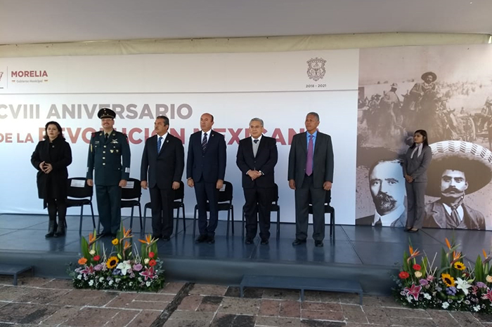 Redacción/ La Voz de Michoacán Morelia, Michoacán. Con el fin de hacer un llamado a la ciudadanía a formar parte de una revolución social y cultural que tendrá el país y de la cual Morelia formará parte, el Secretario del Ayuntamiento, Humberto Arróniz Reyes realizó un llamado al cambio social necesario en México en aras de construir una sociedad más justa y equitativa. Video: Samuel Herrera Jr. Lo anterior como legado y en conmemoración del 108 Aniversario de la Revolución Mexicana, ceremonia en la cual, el encargado de la política interna del municipio fungió como orador oficial, acompañado por el presidente municipal, Raúl Morón Orozco, en representación del gobernador del Estado, el secretario de Educación en la entidad, Alberto Frutis Sólis, el presidente del Supremo Tribunal de Justicia y del Consejo del Poder Judicial a nivel estatal, Marco Antonio Flores Negrete, el comandante del 12vo. Batallón de Infantería, Alberto Román González y la síndico, Labinia Aranda Ortega. Video: Samuel Herrera Jr. Arróniz Reyes destacó que la Revolución es la modificación de estructuras sociales y económicas en un sistema capitalista que predomina, por lo cual se hace el llamado al cambio social que el país necesita en la forma de gobernar y tiene por objetivo cambiar las condiciones de vida la gente y ampliar los marcos de libertad y justicia. El Secretario del Ayuntamiento recordó que la Revolución Mexicana significó un conflicto armado que permitió refundar el país, así como el fin de la dictadura Porfirista, en la que se abanderó el pensamiento “Sufragio efectivo, no reelección”, así como “La tierra es de quien la trabaja”. Con este acto y ceremonia cívica y previamente un izamiento de la Bandera Nacional en la Plaza Melchor Ocampo encabezado por el secretario del Ayuntamiento, Humberto Arróniz, la comisionada municipal de Seguridad Municipal, Julisa Suaréz Bucio y el secretario de Educación en el Estado, Alberto Frutis, el Ayuntamiento de Morelia conmemoró este 108 Aniversario de la Revolución Mexicana.