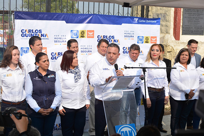 Redacción/ La Voz de Michoacán Morelia, Michoacán. Mientras nuestros adversarios evaden y le sacan la vuelta al problema más sentido de los morelianos, yo me ocupo desde el primer minuto de la campaña municipal, en presentar mis propuestas para recuperar la seguridad y la tranquilidad de los ciudadanos, lo cual es uno de los temas más urgentes para los morelianos y solamente se logrará con coordinación entre los diferentes niveles de gobierno, la campaña tiene que tratarse de los problemas de la gente y sobre cómo vamos a resolverlos los que queremos gobernarla, aseguró Carlos Humberto Quintana Martínez, candidato a la presidencia municipal “Por Michoacán al Frente”, al entregar por escrito, el compromiso de firmar el Acuerdo de Coordinación para la Seguridad Pública entre el municipio de Morelia, el Gobierno del Estado y la Federación. Acompañado por los integrantes de su planilla, encabezada por la candidata a Sindica, Minerva Bautista Gómez, el abanderado de los partidos Acción Nacional, PRD y Movimiento Ciudadano, informó que el documento, entregado ante la Secretaría de Seguridad Pública y la Procuraduría de Justicia Estatal, garantiza que el próximo primero de julio que resulte electo se recuperará la seguridad, la paz y la tranquilidad de Morelia con el trabajo coordinado, luego de que la capital del estado se ubica entre las 50 ciudades más peligrosas del país. Vengo como moreliano, cansado de ver la inseguridad en la que vivimos, a entregar a la Oficialía de Partes, tanto de la Secretaría de Seguridad Pública como la Procuraduría General de Justicia del Estado, nuestras propuestas y compromisos, así como para decirles de la urgencia que se tiene para el trabajo coordinado del gobierno del estado, la federación y el municipio. Mi mayor compromiso es con nuestra ciudad, haremos lo posible, todo lo que esté en nuestras manos para contar con una Morelia segura, una de las mejores del país porque estoy seguro que es posible, solamente se requiere voluntad”, afirmó. Señaló que ante las condiciones de inseguridad que se tienen en el municipio, donde Morelia se ubica entre los cinco municipios más inseguros del estado, es imperante que las políticas se enfoquen a cambiar esta realidad, puntualizó Quintana Martínez. No es posible que Morelia se encuentre entre las 50 ciudades más peligrosas de todo el país, esto no puede estar sucediendo, todo por la falta de voluntad de las autoridades, por lo que vengo a trabajar por sus hijos, por las mujeres, hombres, para poder juntos transformar el municipio que todos queremos". A partir de la experiencia legislativa de Carlos Quintana en el Congreso local, es como se ha logrado ubicar algunos de los temas más sentidos por la población en materia de seguridad; en base a esto, el candidato presentó cinco compromisos del Plan de Seguridad para Morelia; más y mejores elementos de seguridad pública, sistemas de inteligencia y vigilancia, trabajo coordinado con los morelianos, así como con el gobierno estatal y federal, además de dignificar la atención a las víctimas del delito Por su parte, la candidata a Sindica “Por Michoacán al Frente”, Minerva Bautista Gómez, aseguró que la coordinación y la prevención son elementos fundamentales para el combate a la delincuencia, tras destacar los cinco compromisos de seguridad propuestos por el candidato al ayuntamiento de Morelia, Carlos Quintana Martínez, subrayó que se requiere hacer efectiva la policía de proximidad, con un patrullaje preventivo en donde exista coordinación con los jefes de tenencia, quienes han tenido años de abandono por administraciones pasadas. Queremos atender a los ciudadanos de Morelia, como ciudadanos de primera para que la atención sea pronta, rápida y eficaz. Además de atacar la impunidad, en la medida que cada delito sea castigado en esa misma proporción, estaremos bajando los índices delictivos”, indicó. Agregó que contar con los programas para la prevención del delito y el apoyo con la federación, serán parte importante para hacer equipo y acabar con este flagelo. PALACIO MUNICIPAL SERÁ LA NUEVA CASA GRANDE DE TODOS LOS MORELIANOS Previo a la entrega del Acuerdo de Coordinación para la Seguridad Pública, Carlos Quintana visitó y saludó a trabajadores de Palacio Municipal, donde reconoció la labor que realizan diariamente en beneficio de los morelianos. El 1 de septiembre estaremos aquí, con la fuerza y el apoyo de la gente que hoy siente que desde este edificio se le han cerrado las puertas, que ante sus solicitudes se les ha rechazado, por eso se generarán cambios de inmediato", comprometió. Indicó que, de conquistar las preferencias del voto de los ciudadanos, durante su gestión el Palacio Municipal se encontrará abierto para escuchar a los morelianos sobre sus necesidades y comprometió que siempre habrá quién atienda a la ciudadanía. El candidato fue respaldado por la planilla de regidores conformada por; Moisés Cardona Anguiano, Martha Berenice Álvarez Tovar, Javier Maldonado Torres, Adanely Acosta Campos, Arturo Vidales Ramos, Ma. Magdalena Barriga y Raúl Montes Polvorilla. De igual forma fue acompañado por la candidata al Senado de la República por el Partido Acción Nacional, Alma Mireya González Sánchez y el coordinador de los diputados locales del PAN, Héctor Gómez Trujillo.