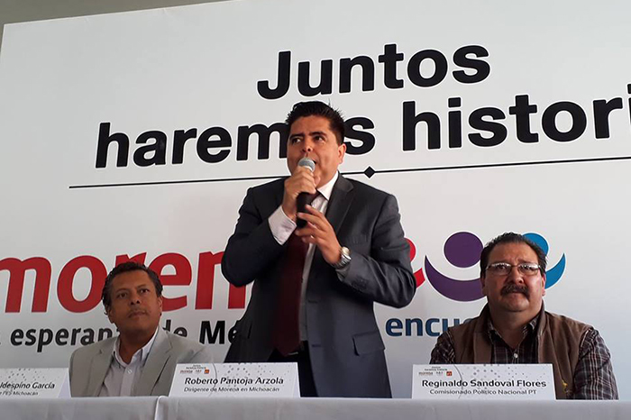 Arturo Molina/La Voz de Michoacán Con el objetivo de conformar una fuerza que haga frente a las otras alianzas políticas, este fin de semana Morena, el Partido Encuentro Social (PES) y el Partido del Trabajo (PT), formalizaron ante el Instituto Electoral de Michoacán (IEM) la coalición "Juntos Haremos Historia", en el que buscarán posicionarse de cara al proceso electoral de este 2018. Las dirigencias y militancia de los tres partidos acudieron ante la autoridad electoral para signar los acuerdos. No obstante, no se ha definido cuál de los tres partidos que integran la coalición encabezará la candidatura por la alcaldía de Morelia. No obstante, Javier Valdespino García, dirigente del Partido Encuentro Social (PES) comentó ante los medios de comunicación que la posible candidatura de Fausto Vallejo Figueroa a la alcaldía de Morelia, no está descartado y es falso lo que circula en algunas notas periodísticas. Luego de la firma del Convenio de Coalición entre Morena, PES y PT, los mismos dirigentes del Movimiento de regeneración Nacional y del Partido del Trabajo, Reginaldo Sandoval, señalaron ante los periodistas, que Fausto Vallejo no está descartado, sino que hasta hoy las dirigencias nacionales trabajan en un método de encuesta para comprobar quien o quienes se encuentran mejor posicionados. Incluso, el líder de Morena Roberto Pantoja Arzola, precisó que será en próximos días cuando se defina la situación y la imagen de quien encabezará los esfuerzos de la coalición por Morelia, entre los que podría aparecer el nombre del expriista. En total la coalición integrada por estos tres partidos se presentará en 110 municipios del estado, según destacó Roberto Pantoja Arzola, dirigente estatal de Morena durante la entrega de la documentación ante el Instituto Electoral de Michoacán (IEM).