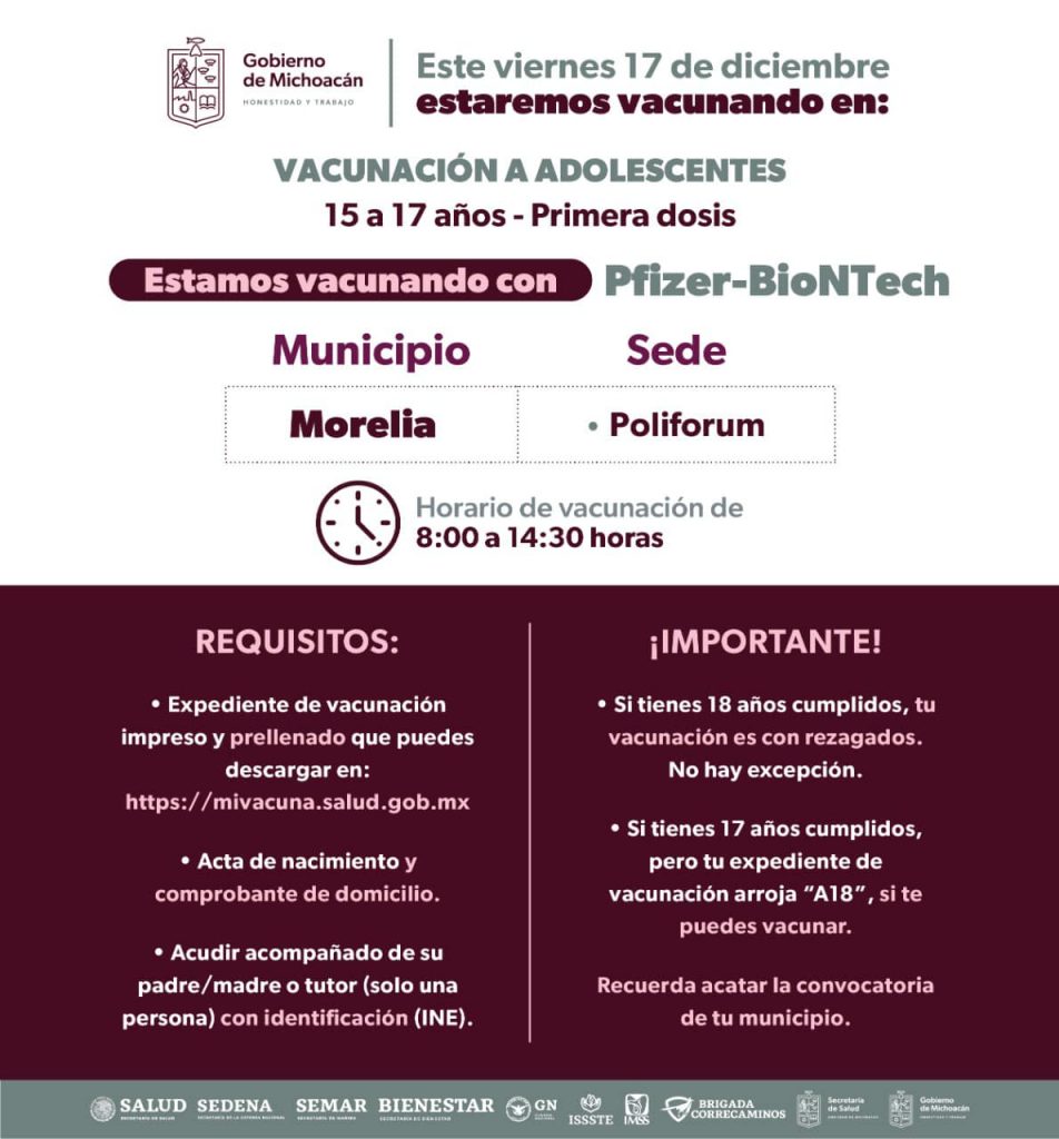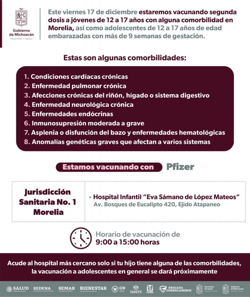Redacción / La Voz de Michoacán Morelia, Michoacán. Para continuar con la jornada de vacunación contra el COVID-19, este viernes 17 de diciembre se estará aplicando la segunda dosis a jóvenes de 12 a 17 años con alguna comorbilidad en Morelia, así como a adolescentes de 12 a 17 años de edad embarazadas con más de 9 semanas de gestación. La aplicación de la dosis será con Pfizer, de 9 de la mañana hasta las 15 horas, en el Hospital Infantil "Eva Sámano de López Mateos", ubicado en el avenida Bosques de Eucalipto 420, Ejido Atapaneo. COMORBILIDADES 1.Condiciones cardíacas crónicas2.Enfermedad pulmonar crónica3.Afecciones crónicas del riñón, hígado o sistema digestivo4.Enfermedad neurológica crónica5.Enfermedades endócrinas6.Inmunosupresión moderada a grave7.Asplenia o disfunción del bazo y enfermedades hematológicas8.Anomalías genéticas graves que afectan a varios sistemas. Además, se estará aplicando primera dosis a adolescentes de 15 a 17 años, también con Pfizer, en el Poliforum en Morelia con un horario de 8 de la mañana a 14:30 horas. Para agilizar el proceso, descarga e imprime tu hoja de vacunación, en:http://mivacuna.salud.gob.mx/