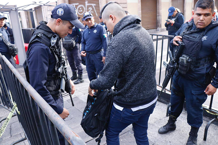 Redacción/La Voz de Michoacán Morelia, Michoacán. La ciudadanía colabora con el dispositivo implementado por el Gobierno de Michoacán a través de la Secretaría de Seguridad Pública (SSP), en el Centro Histórico de Morelia. Son 12 accesos dispuestos con arcos detectores de metales, para garantizar unas fiestas patrias en armonía y paz social. Coordinados con elementos de distintas corporaciones municipales, federales y estatales, agentes de la Policía Michoacán se encuentran vigilando los tres anillos de seguridad, donde han sido instaladas vallas metálicas para el cierre de 20 calles, así como 12 arcos detectores de metal e igual número de cabinas de Rayos X, para el ingreso controlado de la ciudadanía. Los accesos al primer cuadro de la ciudad: Los puntos de control y acceso están instalados en las siguientes vías: Avenida Francisco I. Madero en sus cruces con Serapio Rendón y Andrés Quintana Roo. Avenida 20 de noviembre, a la altura de Guillermo Prieto y Morelos Norte. En la calle Corregidora se encuentra tres accesos en las esquinas con Abasolo, Hidalgo y Morelos Sur. Antonio Alzate, en su cruce con Vasco de Quiroga. Calle Allende, equinas con Abasolo y Morelos Sur. Avenida Francisco I. Madero, en sus cruces con Morelos Norte y Guillermo Prieto. OBJETOS Y PRODUCTOS NO PERMITIDOS: Bebidas alcohólicas Objetos punzocortantes Armas de fuego Encendedores Navajas Juegos pirotécnicos Drones