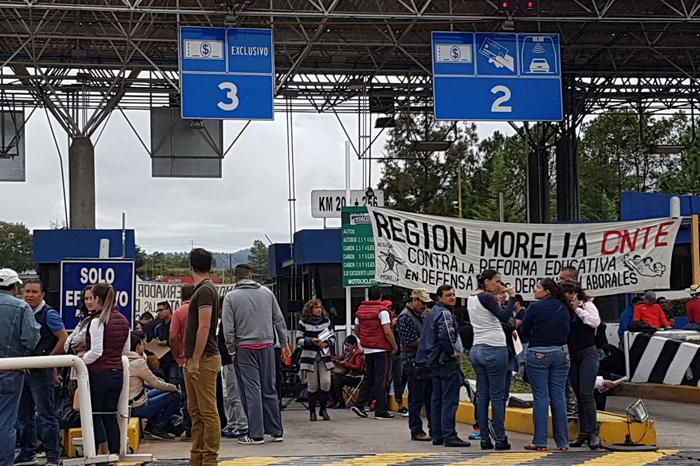 Juan Bustos/La Voz de Michoacán Morelia, Michoacán. En protesta por la Reforma Educativa y en exigencia de adeudos pendientes, miembros de la sección XVIII de la Coordinadora Nacional de Trabajadores de la Educación (CNTE) inició este miércoles un paro de 48 horas en los 113 municipios de Michoacán. Es de mencionar que el magisterio “disidente”, liderado por Víctor Zavala Hurtado, permite el libre paso de automovilistas en las casetas de peaje de las autopistas Siglo XXI, de Occidente, Pátzcuaro-Cuitzeo y Zitácuaro-Toluca. Autoridades han señalado que los maestros podrían hacer un “puente” para reiniciar las clases hasta la próxima semana. La CNTE alista una “megamarcha” para el jueves desde los cuatro puntos cardinales de Morelia hacia el primer cuadro de la ciudad, donde realizarán un mitin.