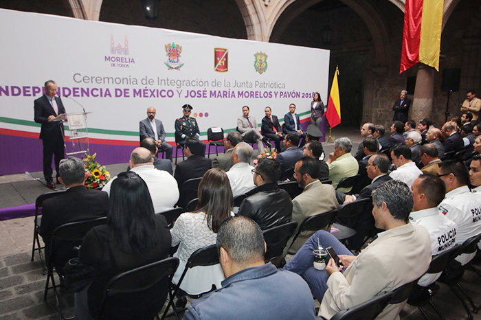 Oscar Mendoza/ La Voz de Michoacán Morelia, Michoacán. Esta mañana, quedó integrada la Junta Patriótica Independencia de México y José María Morelos y Pavón 2018 a fin de integrar las actividades y celebraciones rumbo al mes patrio. En ceremonia desde el Palacio del Ayuntamiento, Juan Carlos Mata, Gerente del Patrimonio de Morelia llamó a repensar el pasado para cimentar el futuro que consolide las tradiciones cívicas y la riqueza cultural del legado histórico. En su discurso, el funcionario recordó el papel de José María Morelos como héroe de la Guerra de Independencia y reformador por lo cual la ciudad pasó de nombrarse Valladolid a la actual Morelia. Por su parte, Fabio Sistos Rangel, síndico municipal hizo un exhortó a continuar con los valores cívicos y patrióticos y proteger los símbolos que nos han dado identidad nacional. Finalmente, Daniel Moncada, subsecretario de Gobernación oficializó la instalación de la junta cívica para que a partir de ahora lleguen las propuestas de actividades y eventos que se llevarán a cabo durante el mes de septiembre para conmemorar un aniversario más del inicio de la Independencia de México y el Natalicio de José María Morelos así como el resto del mes patrio.