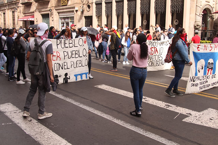 Redacción / La Voz de Michoacán Morelia, Michoacán. Normalistas del estado, quienes se manifestaron este jueves con una marcha al primer cuadro de la ciudad, retuvieron una unidad repartidora a la altura de Las Tarascas para después atravesarla en una calle e impedir el paso vehicular. Video: Sam Herrera Jr. Alrededor de las 11:00 horas se ubicaron en las inmediaciones de Catedral sobre la Avenida Madero; la circulación vial fue interrumpida. Los estudiantes también bloquearon el paso a la altura de Las Tarascas. Del monumento a Lázaro Cárdenas con rumbo a Palacio de Gobierno avanzó el contingente con alrededor de 100 jóvenes. Video: Samuel Herrera Jr. Los estudiantes piden diálogo con el encargado de despacho de la Secretaría de Educación en el Estado (SEE), Héctor Ayala, en exigencia de los compromisos que aseguran no se les han cumplido, así como apoyos pendientes. Los normalistas aseguran que hay una intención de reducir la matrícula por parte de la autoridad, con lo cual no están de acuerdo.