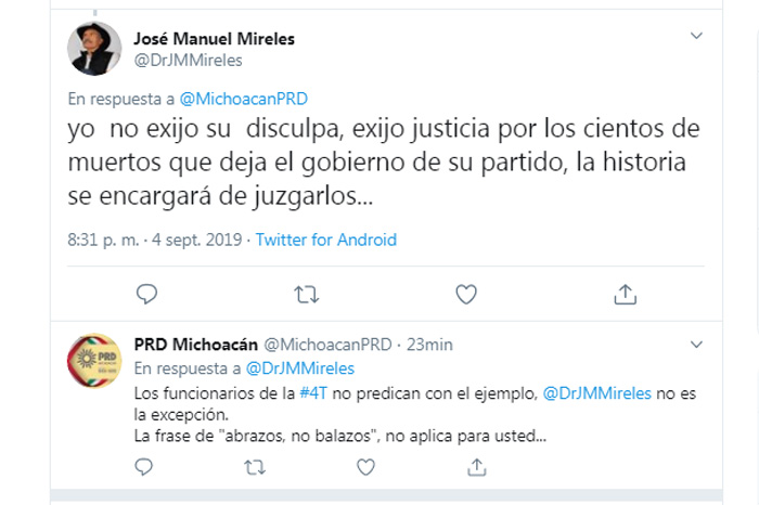 Redacción/ La Voz de Michoacán Morelia, Michoacán. Tras la polémica declaración del subdelegado del ISSSTE en Michoacán, José Manuel Mireles Valverde, en Twitter se desató la "guerra digital". Luego de que el CEE-PRD exigiera una disculpa pública de Mireles por haber llamado “pirujas", a las derechohabientes del ISSSTE, la respuesta de éste no se hizo esperar. Desde el CEE-PRD, exigimos a @DrJMMireles que se disculpe públicamente por haber llamado “pirujas", a las derechohabientes del ISSSTE. ¿Esos son los servidores públicos de la Cuarta Transformación?#DeAquíNOsomos — PRD Michoacán (@MichoacanPRD) September 5, 2019 El exlíder de autodefensas en Michoacán dijo que él le exigía justicia al PRD "por los cientos de muertos que deja el gobierno de su partido, la historia se encargará de juzgarlos...". A lo que el PRD Michoacán respondió: "Los funcionarios de la #4T no predican con el ejemplo, @DrJMMireles no es la excepción. La frase de "abrazos, no balazos", no aplica para usted..."