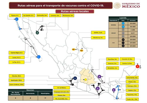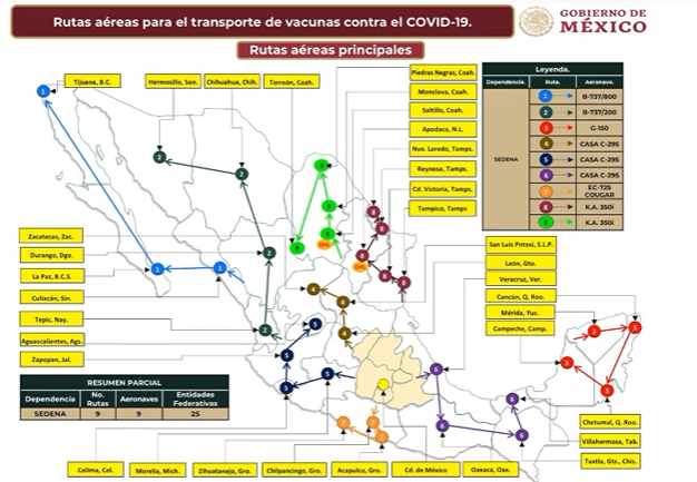 Redacción / La Voz de Michoacán Ciudad de México. Luis Cresencio Sandoval, secretario de la Defensa Nacional, dio a conocer el plan de distribución de las vacunas anticovid de Pfizer que llegarán hoy a la Ciudad de México y Monterrey y las cuales se empezar a distribuir a partir de este miércoles 17 de febrero a 32 entidades federativas para vacunar al personal médico. El secretario de la Defensa Nacional, además, dio a conocer que se utilizarán 46 aeronaves, 9 rutas aéreas y 182 rutas terrestres. En el caso de Michoacán, la ruta que se seguirá para la transportación será Morelia-Apatzingán-Lázaro Cárdenas. Asimismo, Sandoval González informó que el domingo 14 de febrero se realizaron 8 rutas aéreas y 179 terrestres para distribuir las 870 mil dosis de la vacuna que ese día llegaron a México. Sólo faltó entregar 17,323 dosis en 8 municipios.