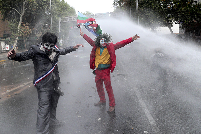 Hombres disfrazados de payasos, uno de ellos como Joker y con una bandera indígena mapuche, son rociados con agua por la policía durante protestas gubernamentales en Santiago de Chile el lunes 4 de noviembre de 2019. (AP Foto/Esteban Felix)