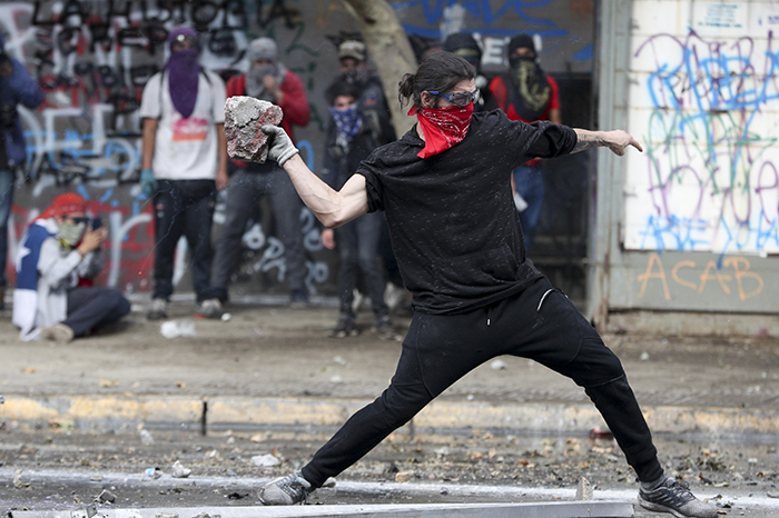 Un manifestante se prepara para lanzar una piedra a la policía durante las protestas en Santiago de Chile el lunes 4 de noviembre de 2019. (AP Foto/Esteban Felix)