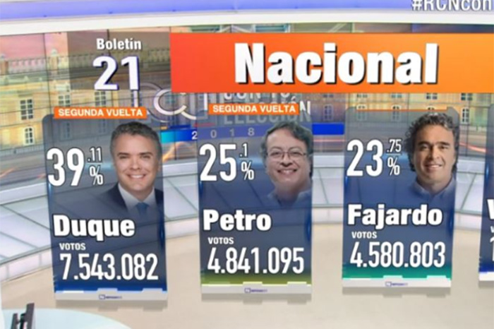 Notimex/ La Voz de Michoacán Bogotá, Colombia. El candidato presidencial de la derecha colombiana, Iván Duque, se consolidaba en primer lugar en los comicios de hoy, sin alcanzar la mayoría necesaria para ganar en primera vuelta, una vez escrutado el 38.13 por ciento de los votos, con 13 millones 560 mil sufragios. https://twitter.com/BlackTheseus/status/1000859154511286273 Duque sumaba 40.10 por ciento, con cinco millones 537 mil 658 votos, seguido por Gustavo Petro, de Colombia Humana, que tenía 24.66 por ciento con tres millones 406 mil 256 votos, y en tercer sitio estaba Sergio Fajardo, con 23.26 por ciento, al sumar tres millones 213 mil 121 votos. "Hoy la decisión es mantener la Coalición Colombia en Bogotá y el país": Antonio Navarro, en sede de Fajardo https://t.co/MUp66TrkrJ #ColombiaDecide pic.twitter.com/A4hYnyv8rW — Noticias Caracol (@NoticiasCaracol) 27 de mayo de 2018 Con estos resultados, se perfila una segunda vuelta entre Duque y el candidato que se sitúe en segundo lugar, un sitio que se disputan Petro y Fajardo, que no lograron consolidar una alianza previa a la primera vuelta de elecciones.