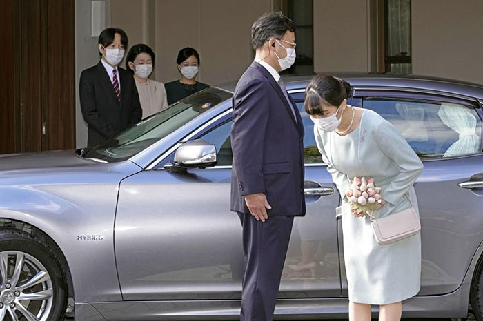Ataviada con un vestido de una pieza en tono azul pastel, collar de perlas y un ramillete de flores color rosa palo, Mako dedicó repetidas reverencias a sus padres, los príncipes herederos Fumihito y Kiko, antes de partir a reunirse con su marido para la comparecencia.