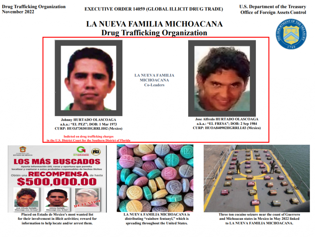 EFE / La Voz de Michoacán Washington, EUA. La Oficina de Control de Activos Extranjeros (OFAC) de Estados Unidos sancionó este jueves al cartel mexicano La Nueva Familia Michoacana y a sus líderes, Johnny Hurtado Olascoaga y José Alfredo Hurtado Olascoaga, por tráfico internacional de drogas. El organismo informó a través de un comunicado que la Nueva Familia Michoacana contrabandea drogas ilícitas hacia y a través de Estados Unidos y que está detrás de la creciente presencia en el país de fentanilo arcoíris. Según la Administración para el Control de Drogas (DEA) de Estados Unidos, esta droga aparece en forma de píldoras/polvo con una variedad de colores, formas y tamaños brillantes y está hecha para atraer a niños y jóvenes. "La acción de hoy tiene como objetivo el liderazgo de uno de los cárteles de la droga más violentos y depravados", dijo en el comunicado el subsecretario del Tesoro para Terrorismo e Inteligencia Financiera, Brian E. Nelson, quien recordó que el fentanilo se cobró la vida de más de 108.000 estadounidenses el año pasado. La Nueva Familia Michoacana es la sucesora de La Familia Michoacana original, que fue señalada por Estados Unidos en 2009 conforme a la Ley de Designación de Cabecillas Extranjeros del Narcotráfico y designada nuevamente el 15 de diciembre de 2021. Opera en aproximadamente 35 municipios mexicanos en los estados de Michoacán, Guerrero, Morelos y el Estado de México, mientras que se está expandiendo a otras regiones del país y genera ingresos del narcotráfico, la minería ilícita y la extorsión. Junto con la distribución de fentanilo, las otras actividades de narcotráfico de la Nueva Familia Michoacana incluyen la siembra de marihuana y amapola y el tráfico de diversas drogas desde América Central, que incluyen metanfetamina, heroína y cocaína, con destino a Estados Unidos. El 24 de junio de 2000, un gran jurado federal en el Tribunal de Distrito de Estados Unidos para el Distrito Sur de Florida emitió una acusación contra Johnny Hurtado por dos cargos relacionados con el intento de posesión y conspiración para distribuir cocaína. Sigue prófugo de estos cargos. Como resultado de la acción de hoy, todas las propiedades e intereses en la propiedad de las personas y entidades designadas que se encuentran en Estados Unidos o en posesión o control de personas estadounidenses deben bloquearse e informarse a la OFAC.