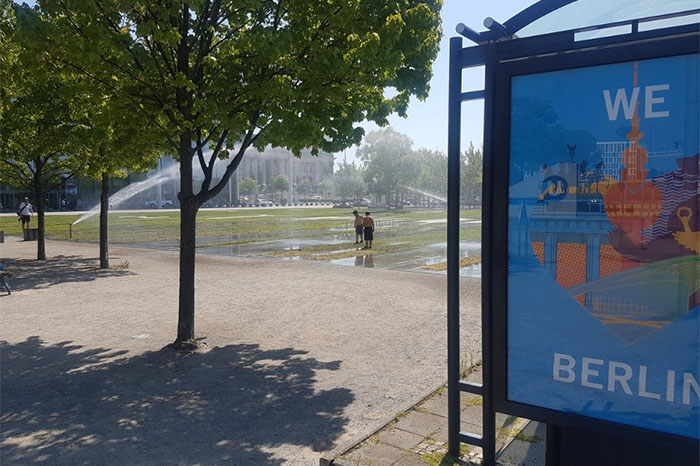 En parques y jardines de la ciudad, los berlineses buscan el frescor del agua, de tal manera que hay padres que llevan a sus hijos pequeños a donde hay fuentes para que jueguen en traje de baño con los chorros.