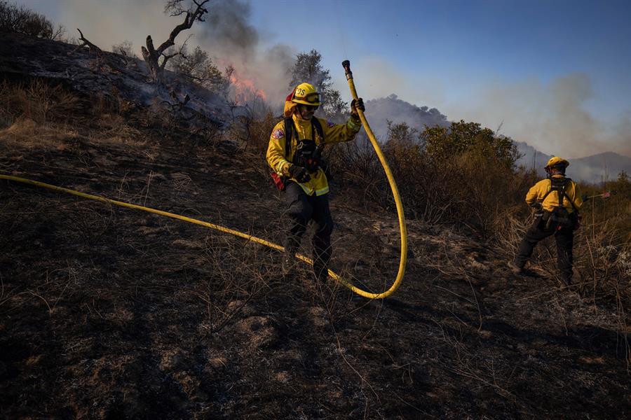 Los Ángeles. Un incendio de rápido movimiento al sur de Los Ángeles ha quemado casi 3.000 hectáreas en las últimas horas, provocando la evacuación de unas 25.000 personas, informaron este viernes las autoridades de California. El fuego, situado a unos 60 kilómetros al sur de la ciudad angelina, cerca de Santa Ana, fue alimentado por los fuertes vientos en esa localidad y cuadriplicó su tamaño en pocas horas. En un comunicado, el Departamento de Protección contra Incendios de California, conocido como Cal Fire, explicó este viernes que los esfuerzos de los cuerpos de bomberos lograron contener el fuego en un 10 % y reducir su tamaño hasta las 2.590 hectáreas. Foto: EFE. Durante esos trabajos de extinción del incendio, dos bomberos fueron heridos y trasladados a un hospital cercano. "Estamos en el proceso de verificar el alcance del daño", escribió la Autoridad de Bomberos del Condado de Orange en Twitter. Mientras las llamas arden en Santa Ana, el Servicio Meteorológico Nacional emitió advertencias de bandera roja por una combinación "particularmente peligrosa" de vientos fuertes y niveles bajos de humedad, condiciones especialmente raras en esta época del año. De hecho, en el condado de Orange se esperan vientos de hasta 80 kilómetros por hora (50 millas por hora) y en el de San Diego de más de 110 (unas 70 millas por hora). Estas alertas estarán activas, por lo menos, hasta el sábado. California está viviendo en 2020 el peor año de su historia en cuanto a número de incendios y superficie quemada, y las autoridades alertan de que la temporada de fuegos todavía podría alargarse unas semanas más, ya que las condiciones meteorológicas son muy secas para ser diciembre. En total se han quemado ya en California más de cuatro millones de acres, que son 1.618.742 hectáreas. Según datos del Cal Fire, el estado ha sufrido este año más de 9.200 incendios, casi 10.500 estructuras han sido dañadas, y se han confirmado 33 muertes relacionadas con los fuegos.