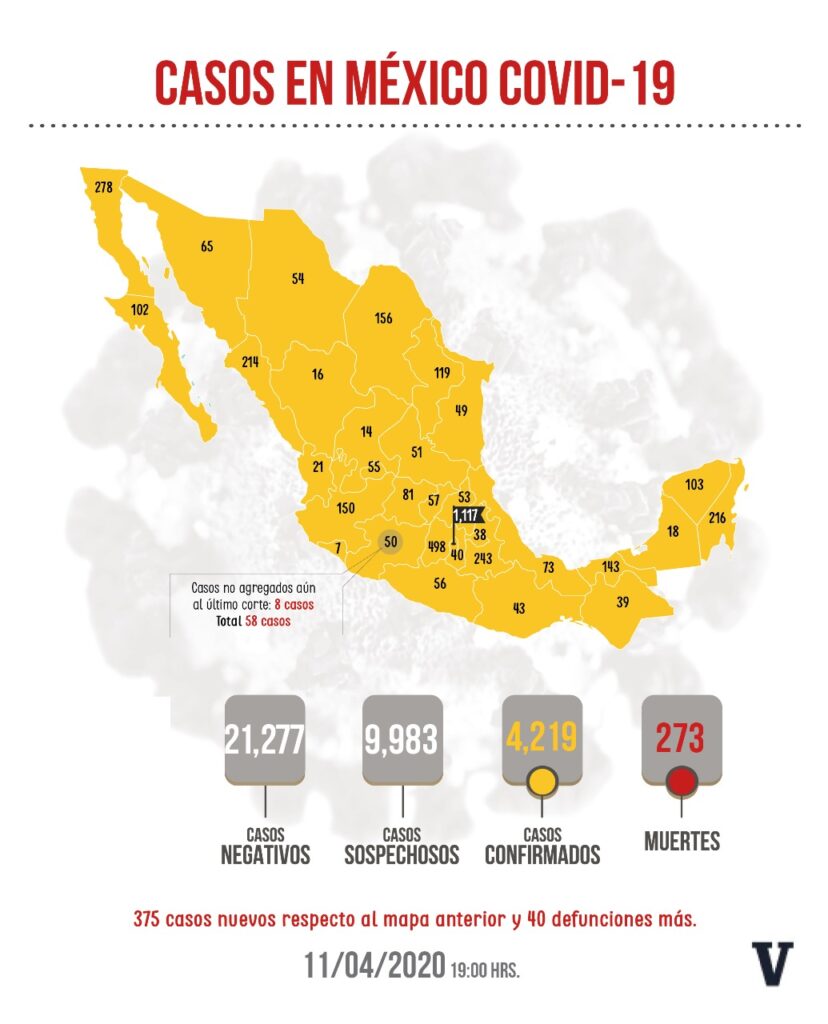 Redacción / La Voz de Michoacán Ciudad de México. Hasta este sábado, en México se registran 4 mil 219 casos confirmados de COVID-19, es decir 375 más en las últimas 24 horas, y 273 muertes, 40 más en un día, reportó el director general de Epidemiología de la Secretaría de Salud (Ssa) federal, José Luis Alomía. En conferencia de prensa, José Luis Alomía detalló que también se han registrado 21 mil 277 casos negativos y 9 mil 983 mil sospechosos, cuyo estado de salud se definirá en las próximas 24 horas. Asimismo, se han estudiado a 35 mil 479 personas. Agregó que los adultos mayores siguen reportando la mayor carga de enfermedad grave, por lo que hizo un llamado a que este grupo etario atienda a la Jornada Nacional de Sana Distancia. Las entidades con más contagios son la Ciudad de México (1,117), Estado de México (498); Baja California (278); Puebla (243); Quintana Roo (216); Sinaloa (214); Coahuila (156); Jalisco (150); Tabasco (143); Nuevo León (119); Yucatán (103) y Baja California Sur (102). Siguen Guanajuato (81); Veracruz (73); Sonora (65); Michoacán (58, aunque el gobierno federal reporta 50 casos); Querétaro (57); Guerrero (56); Aguascalientes (55); Chihuahua (54); Hidalgo (53) y San Luis Potosí (51). Los 11 estados restantes registran menos de 50 casos. De los 4 mil 219 casos confirmados en el país, 33 por ciento ha requerido hospitalización, y de estos, 440 fueron reportados como estables, 769 como graves y 165 fueron intubados. Del total de contagios en el país, 42 por ciento ya se ha recuperado a la enfermedad de COVID-19, mientras que 52 por ciento está todavía en aislamiento. Las comorbilidades más comunes presentes en los casos de fallecimiento son hipertensión, diabetes y obesidad. Este sábado, la Secretaría de Relaciones Exteriores (SRE) dio a conocer que hasta la noche del viernes se habían repatriado a 8 mil 880 mexicanos que permanecían varados en distintas partes del mundo, debido a la propagación del Covid-19. Destacó la SRE que aún quedan 2 mil 842 compatriotas que buscan la manera de salir del lugar en el que se encuentran.